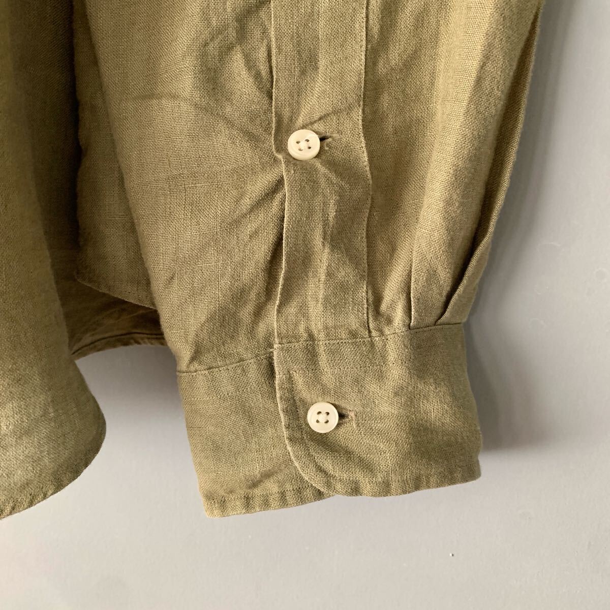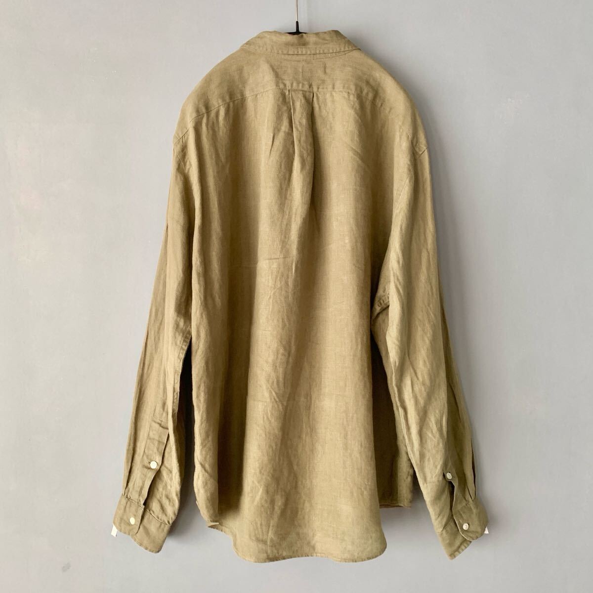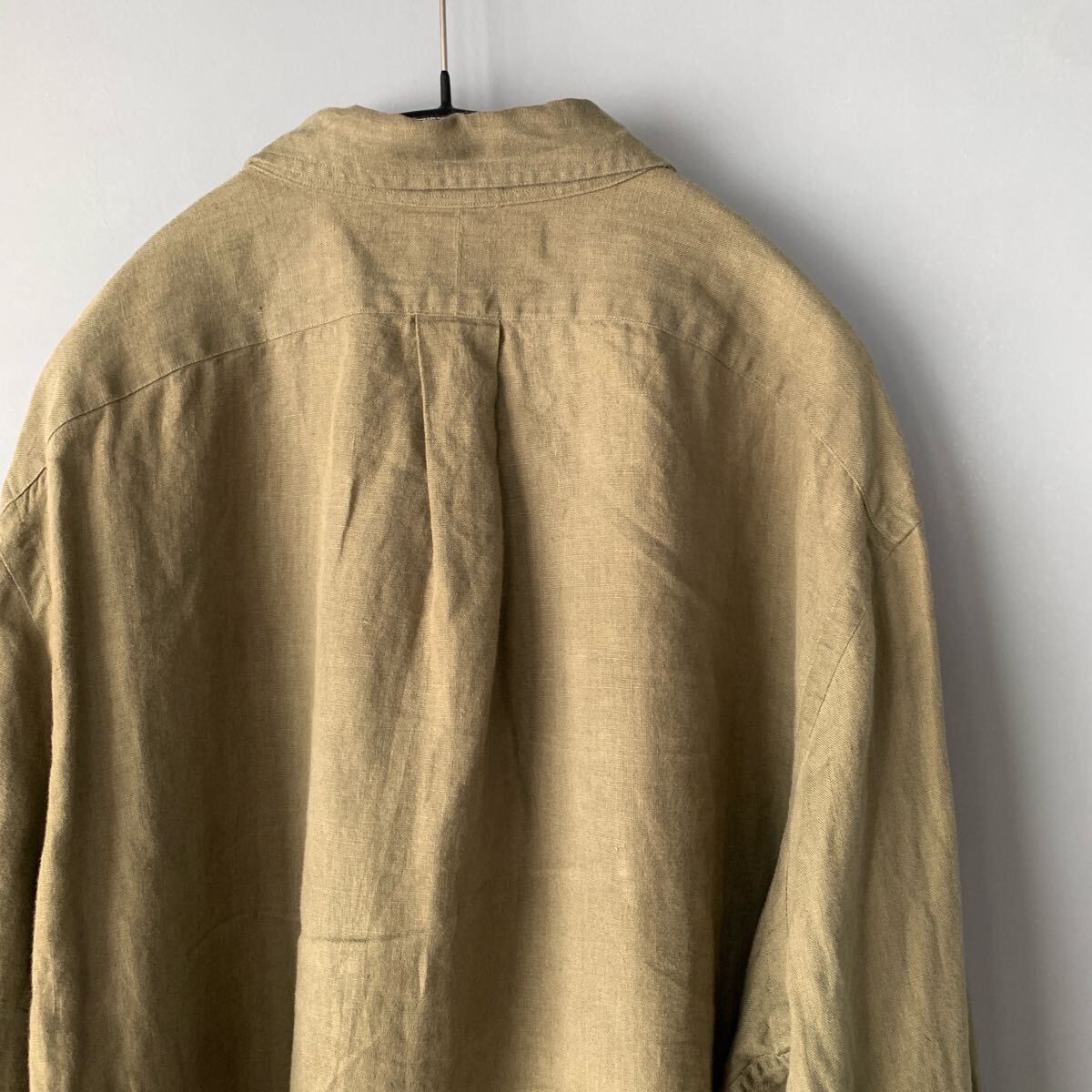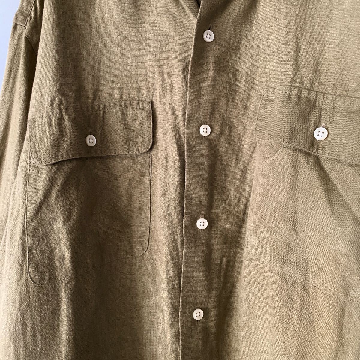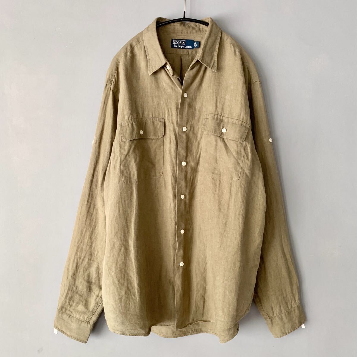 ラルフローレンのリネンシャツです。USAモデルで、オーバーサイズなフィット感です。しっかりと厚みのあるリネンも着込むうちにどんどん馴染んできそうです。ポロ刺繍なしの、ダブルポケット仕様でワークウェアな雰囲気もありとても良い感じです。袖をまくって止められるようのループとボタンが付いています。