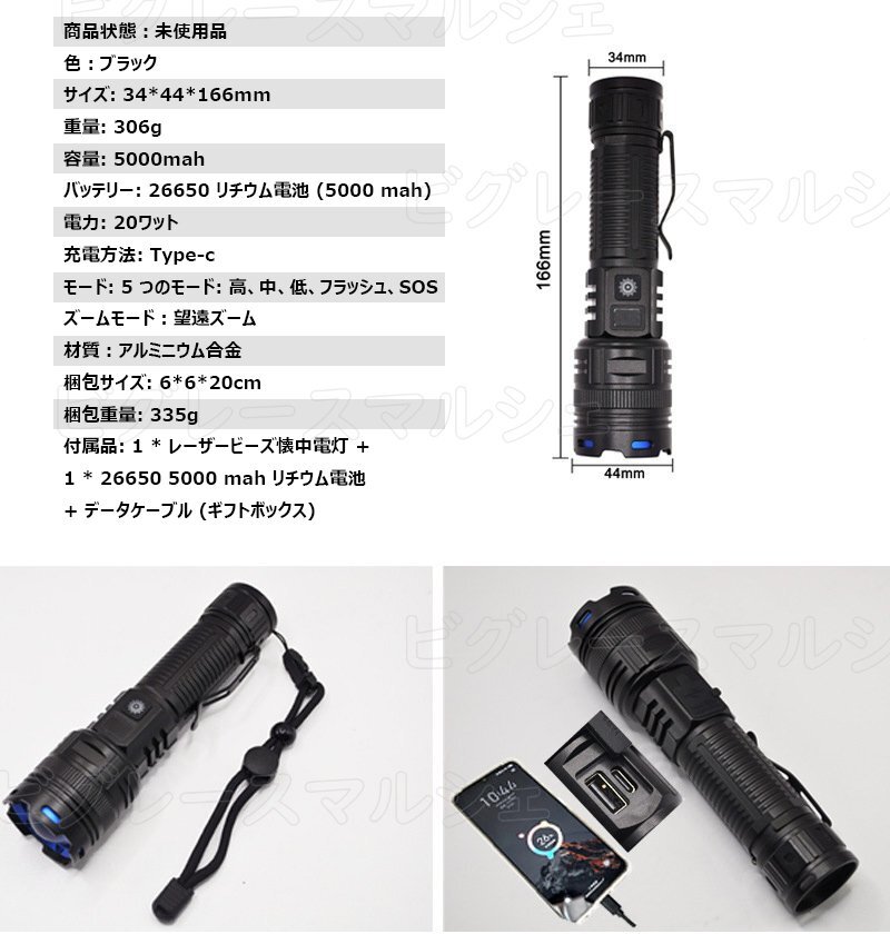 【新品未使用】 充電式 懐中電灯 超強光 LED懐中電灯 50000ルーメン 防水IPX67 5段調光 充電式 アルミ合金製 登山/防災 5000mAh