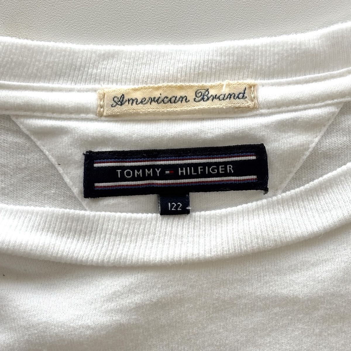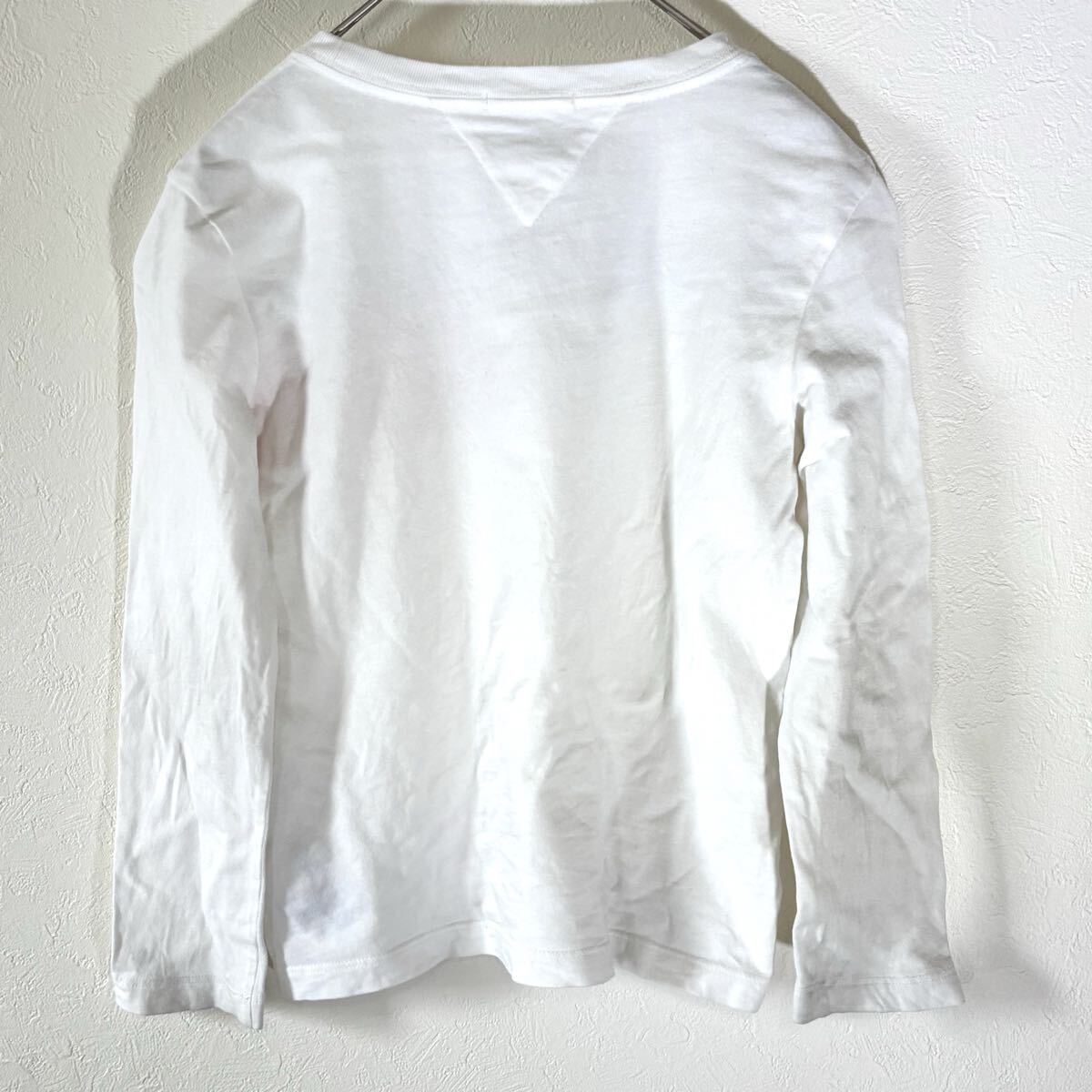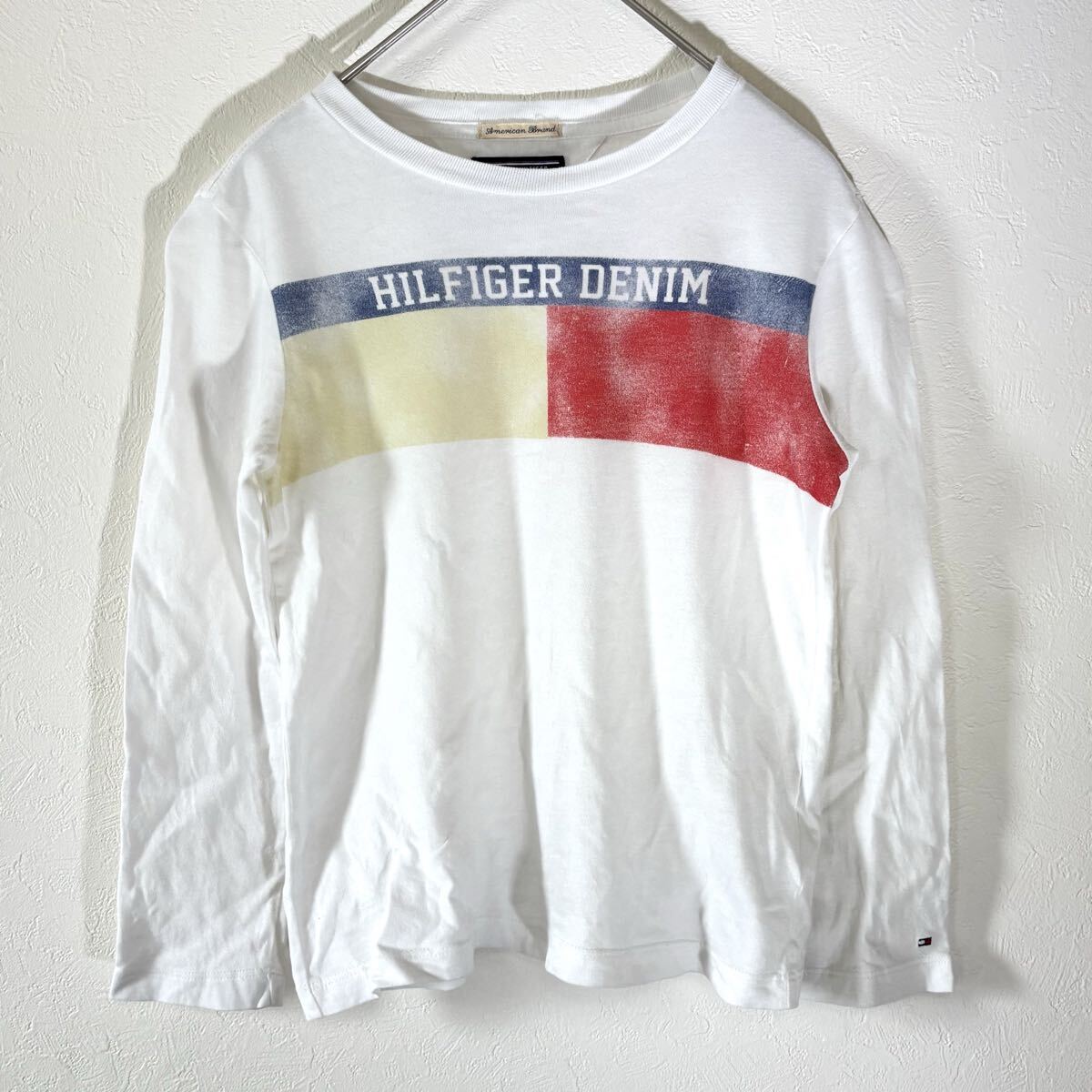 トミーヒルフィガー(Tommy Hilfiger)のキッズ長袖Tシャツです。胸元に「HILFIGER DENIM」のビッグロゴプリント、袖口にフラッグ刺繍入り。プリント部分はデザインとしてかすれ加工が施されており、ヴィンテージ感ある仕上がりになっています。コットン100%でお子様の普段着に最適です。