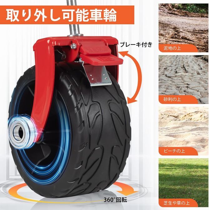 【取り外し可能大型タイヤ】 ダブルフロントブレーキと特大の360°を回すホイール(幅:8cm、直径:16cm)を付けていて、斜面道路、芝生、ビーチ(砂浜)、泥まみれの道路はもちろん、さまざまな凹凸のある地面に至るまで対応することができます。 凹凸のある悪路や砂浜で埋まる心配がない。余計に力を出す必要がなく、どんなところでも大活躍します。Overmont 特有の取り外し可能タイヤ設計で、より省スペースに収納しながら、いつでもタイヤを交換できます。