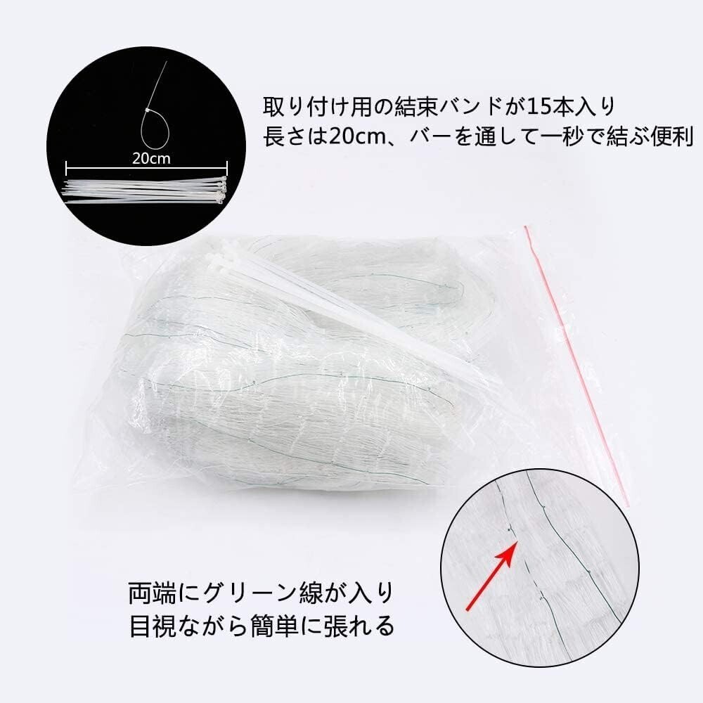 鳥よけネットの両端に緑の確認ラインが入っておりますので、目視ながら張れて、15本結束バンド付き、女性一人でも気軽に取り付けられます。