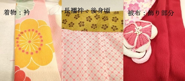 | 【祝着】 身丈 69cm(肩から) 裄丈 40.5cm(肩上げ 3cm) 袖丈 56cm 縫込み 2cm 袖幅 26.5cm 前幅 17cm 後幅 19cm 着物縫いこみ 内揚げ 0cm (腰上げ 8cm) 裄 お袖側 約1cm 身頃側 約0cm 【長襦袢】 身丈 67cm(肩から) 裄丈 37cm(肩上げ 3.5cm) 袖丈 54.5cm 縫込み 2.5cm 袖幅 24.5cm 前幅 15.5cm 後幅 19.5cm 着物縫いこみ 内揚げ 0cm (腰上げ 0cm) 裄 お袖側 約2cm 身頃側 約0cm 【被布】 身丈 49.5cm(肩から) 裄丈 15cm(肩上げ 2cm) 《 サイズについてはこちら 》 |
