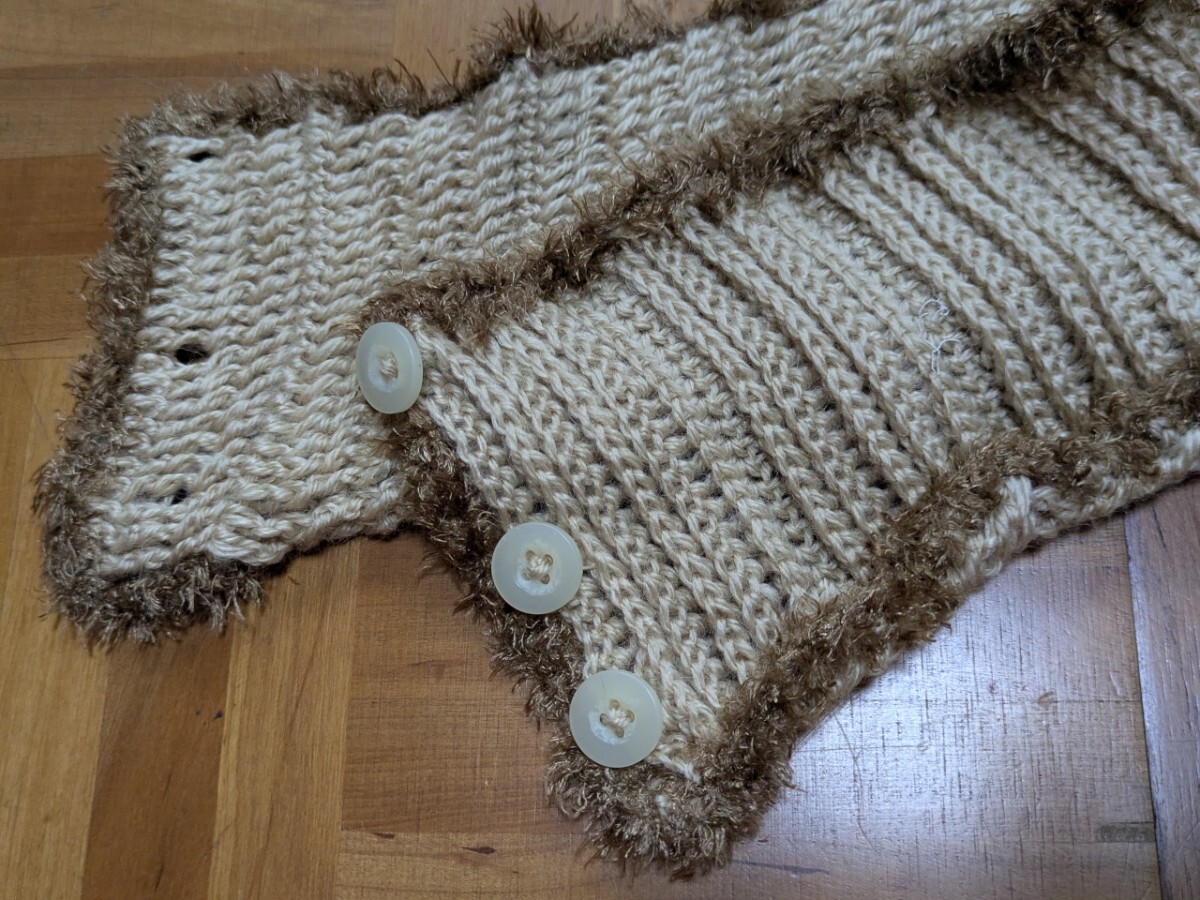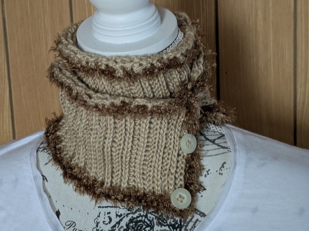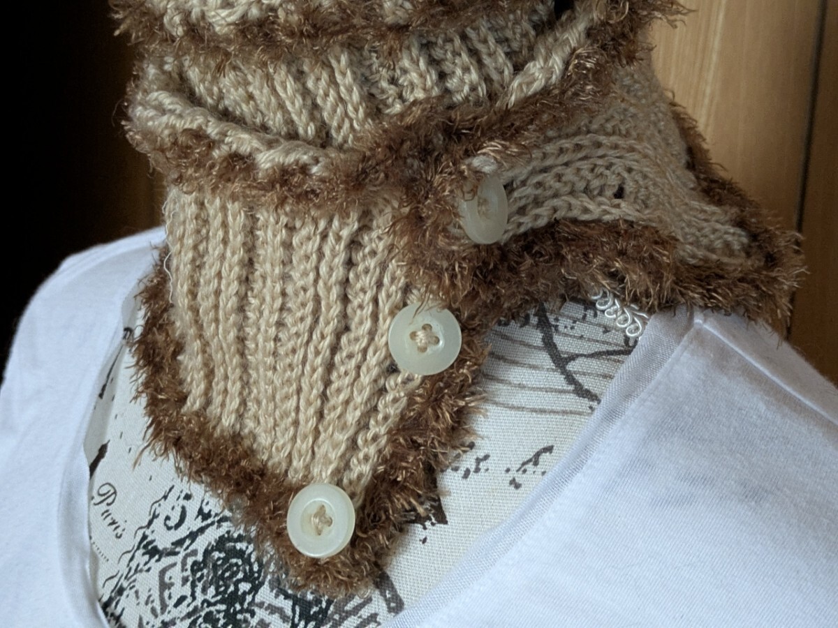 ファーを周りに編み込んであり、ボタン3つでいろんなアレンジが出来るマフラーです。