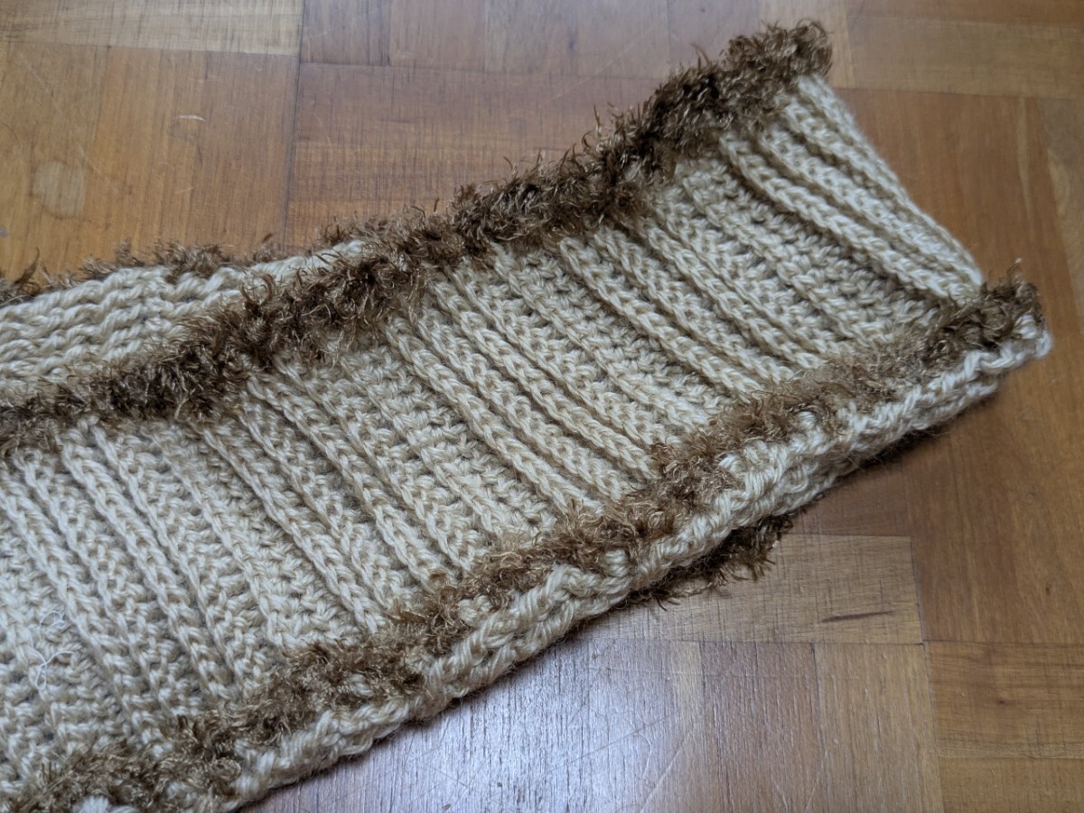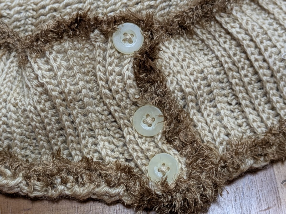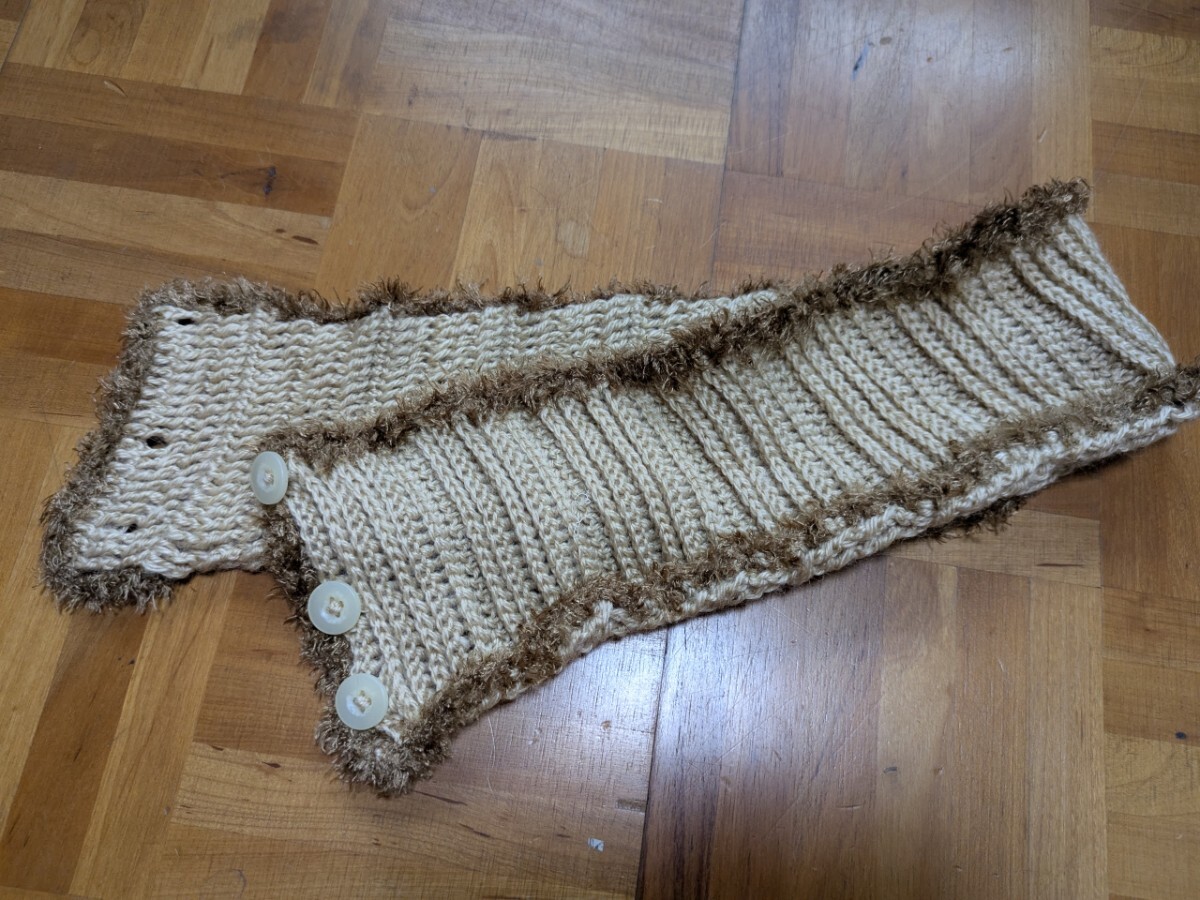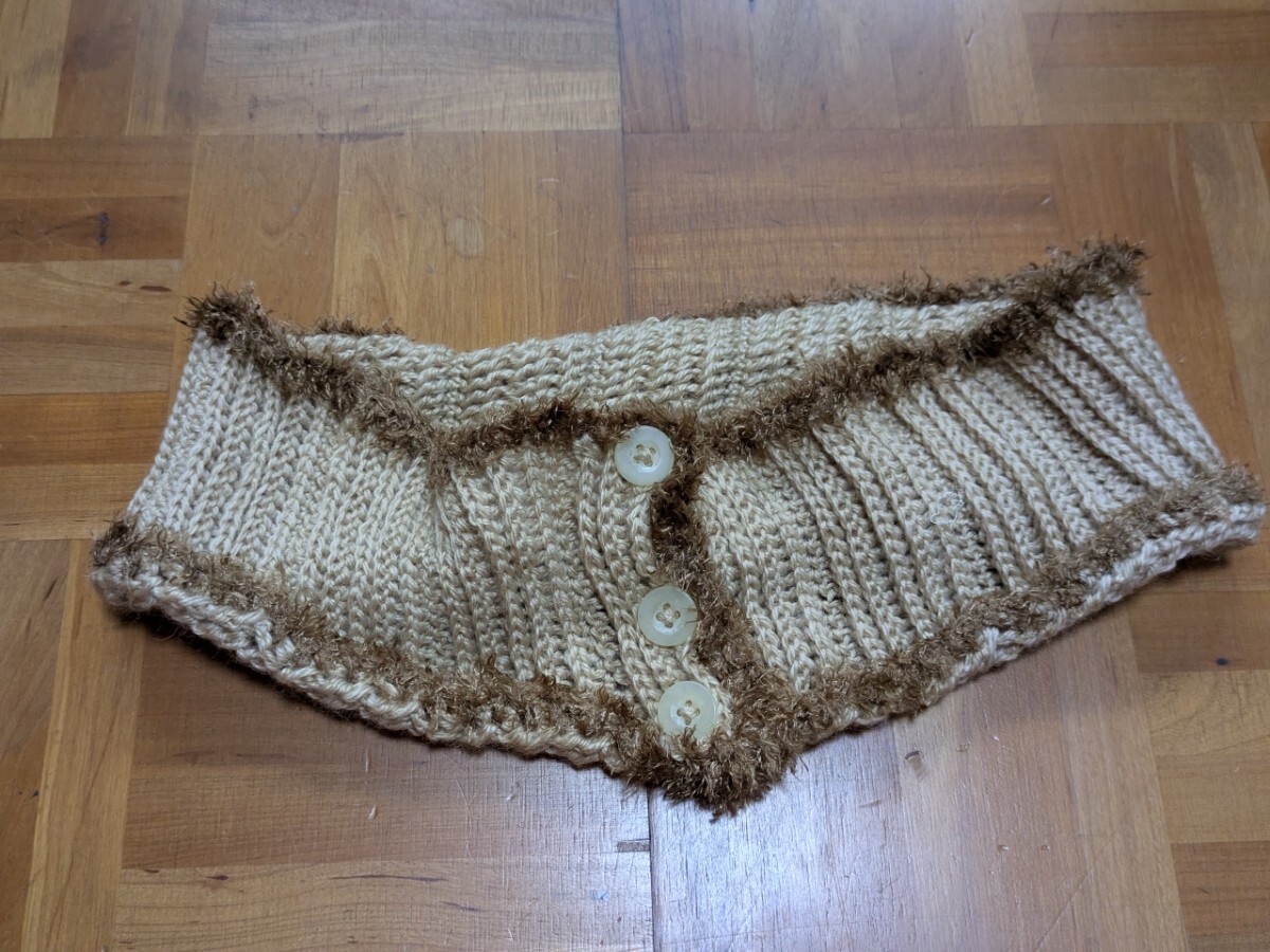 ファーを周りに編み込んであり、ボタン3つでいろんなアレンジが出来るマフラーです。