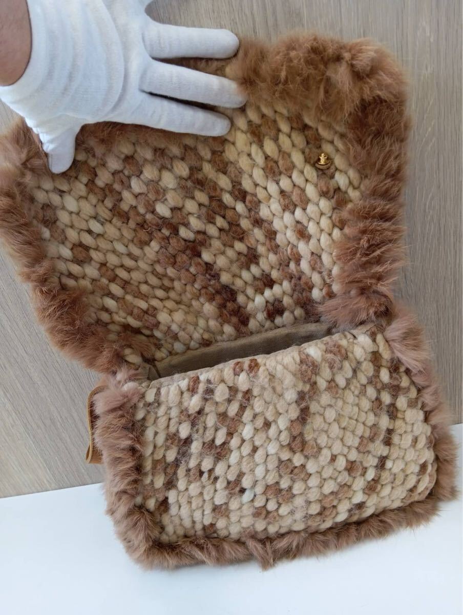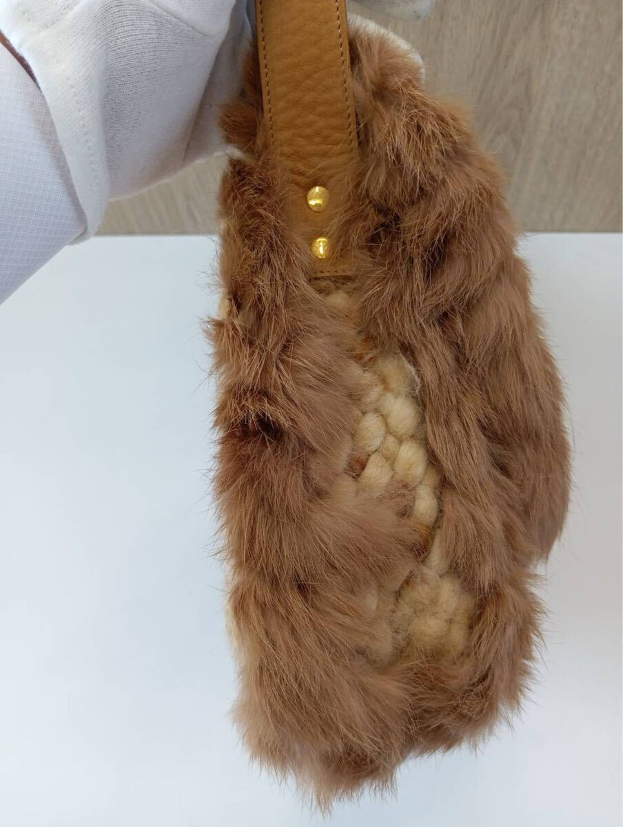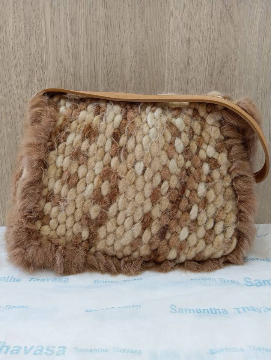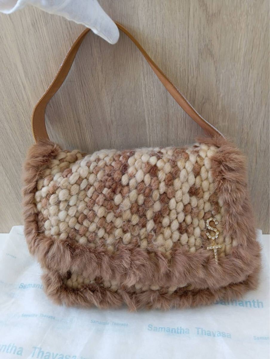 Samantha Thavasaサマンサタバサ ラインストーン付き ショルダーバッグ ラビットファー 茶ブラウン 肩掛け バッグかばん 保存袋付き 現状品