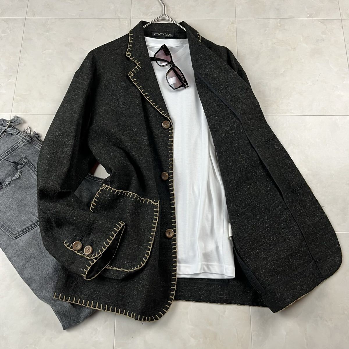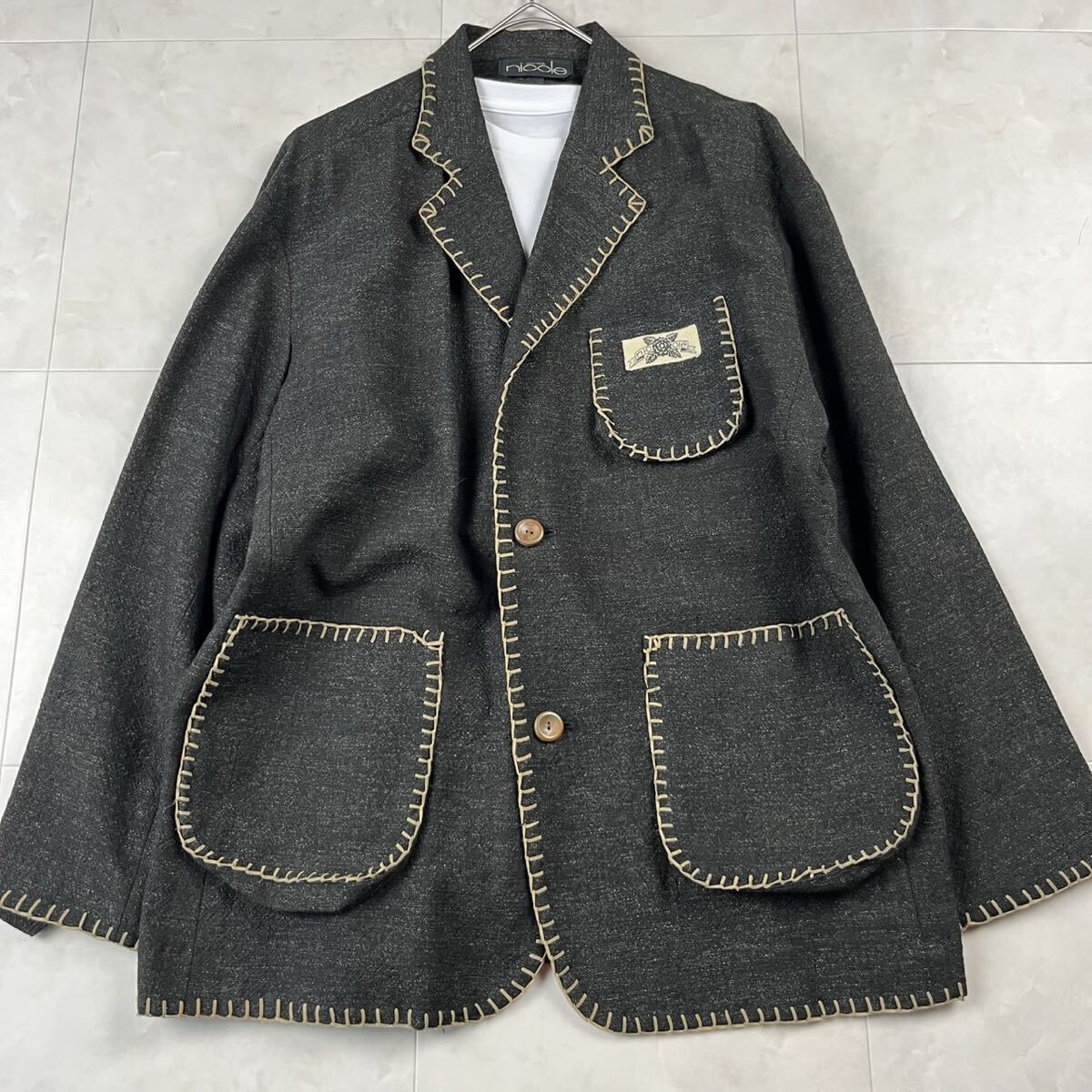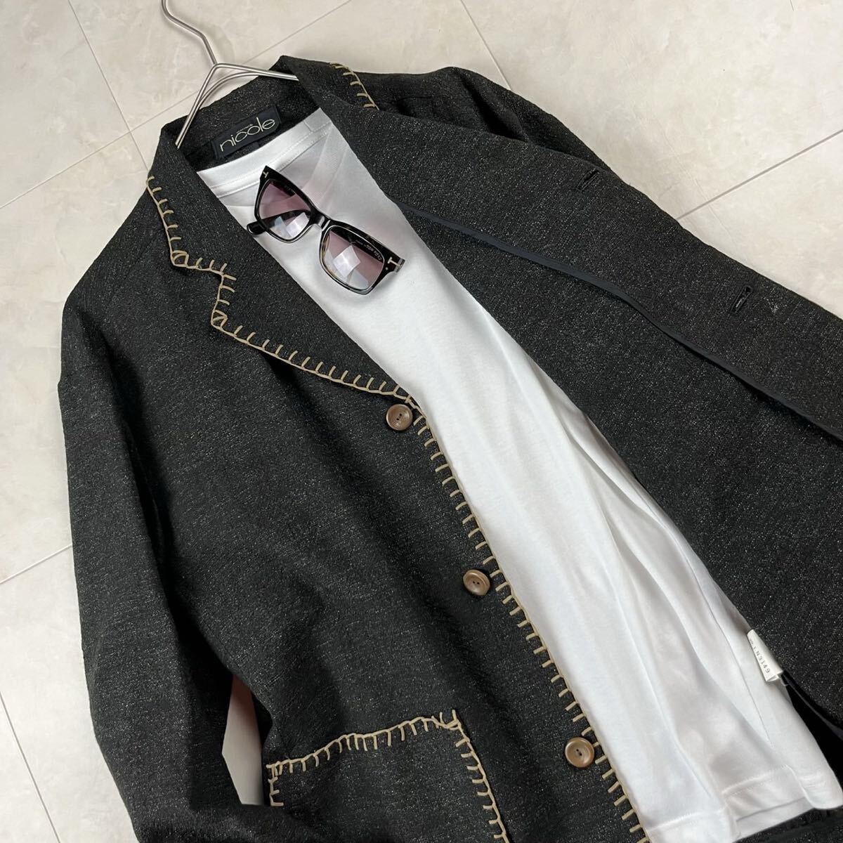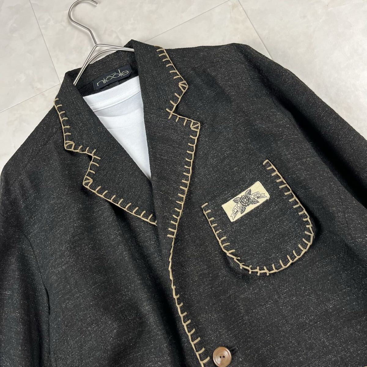 個性的なステッチ装飾が目を惹く、NICOLE(ニコル)のテーラードジャケットです。大人の落ち着きと遊び心を兼ね備えた一着で、オンオフ問わず着回しが可能です。希少なデザインでお探しの方におすすめです。