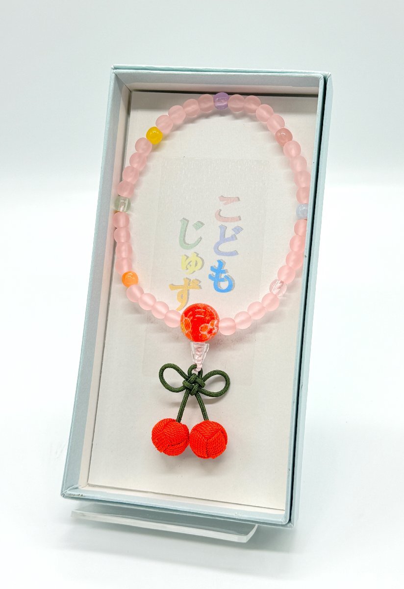 【三枝堂】新品 子供用数珠 「さくらんぼ房 ピンク」 外箱入り 人絹房 ガラス製 ☆送料は当社負担☆