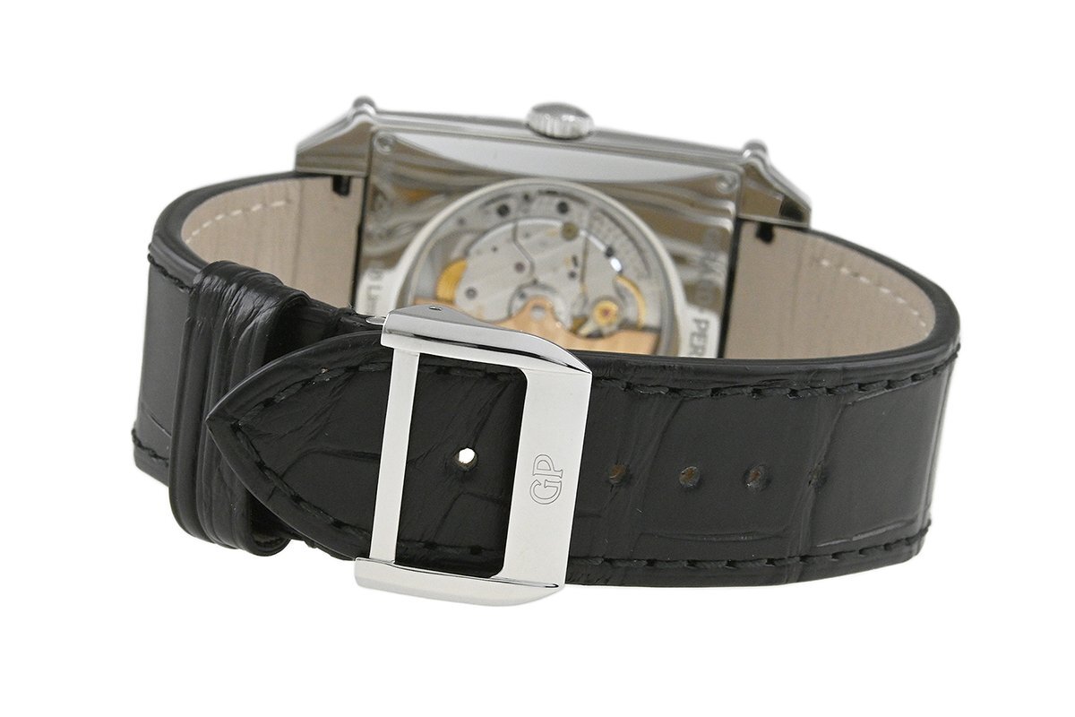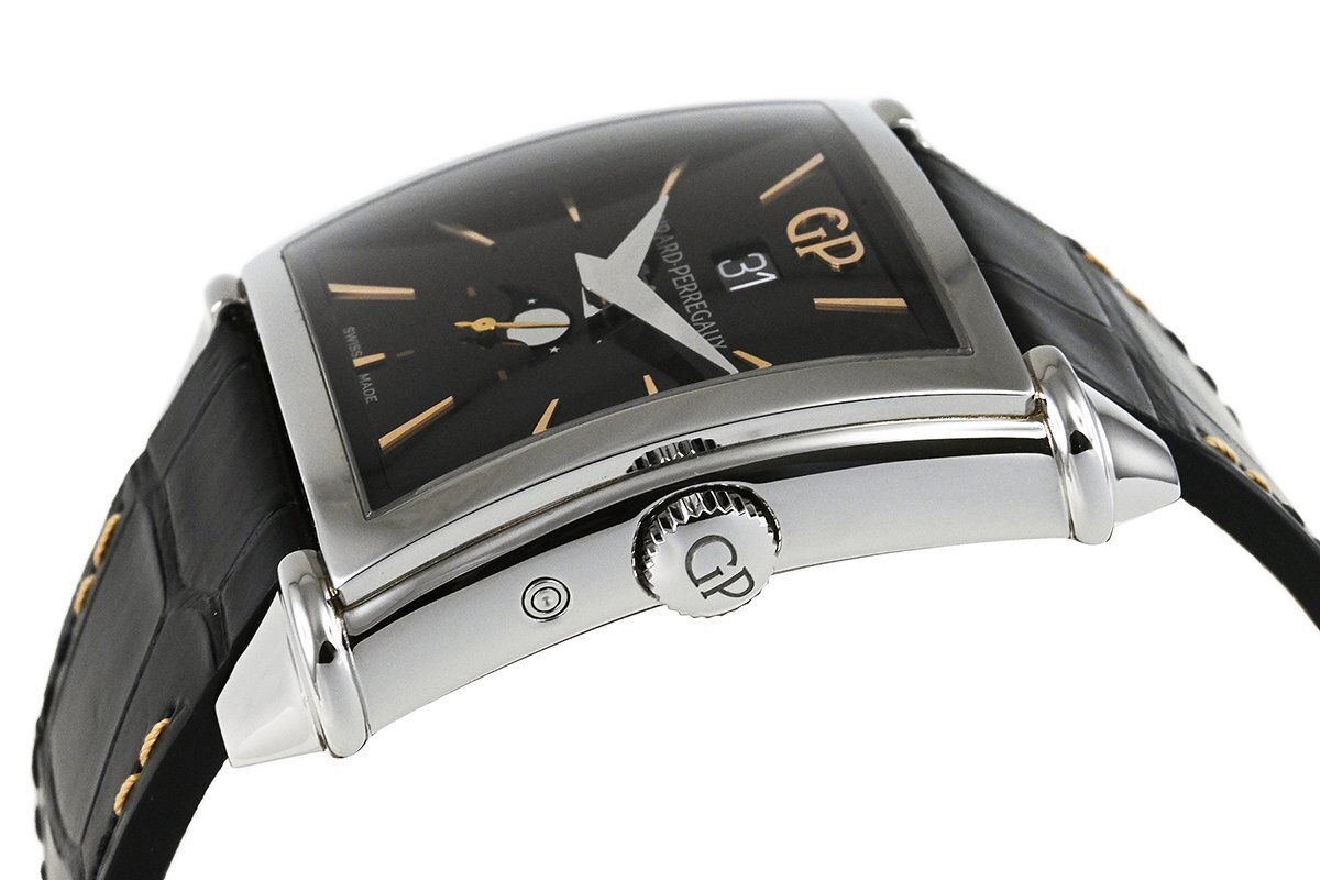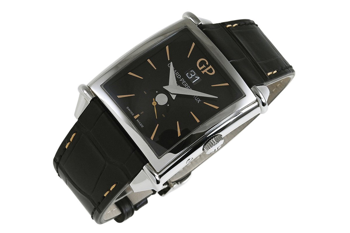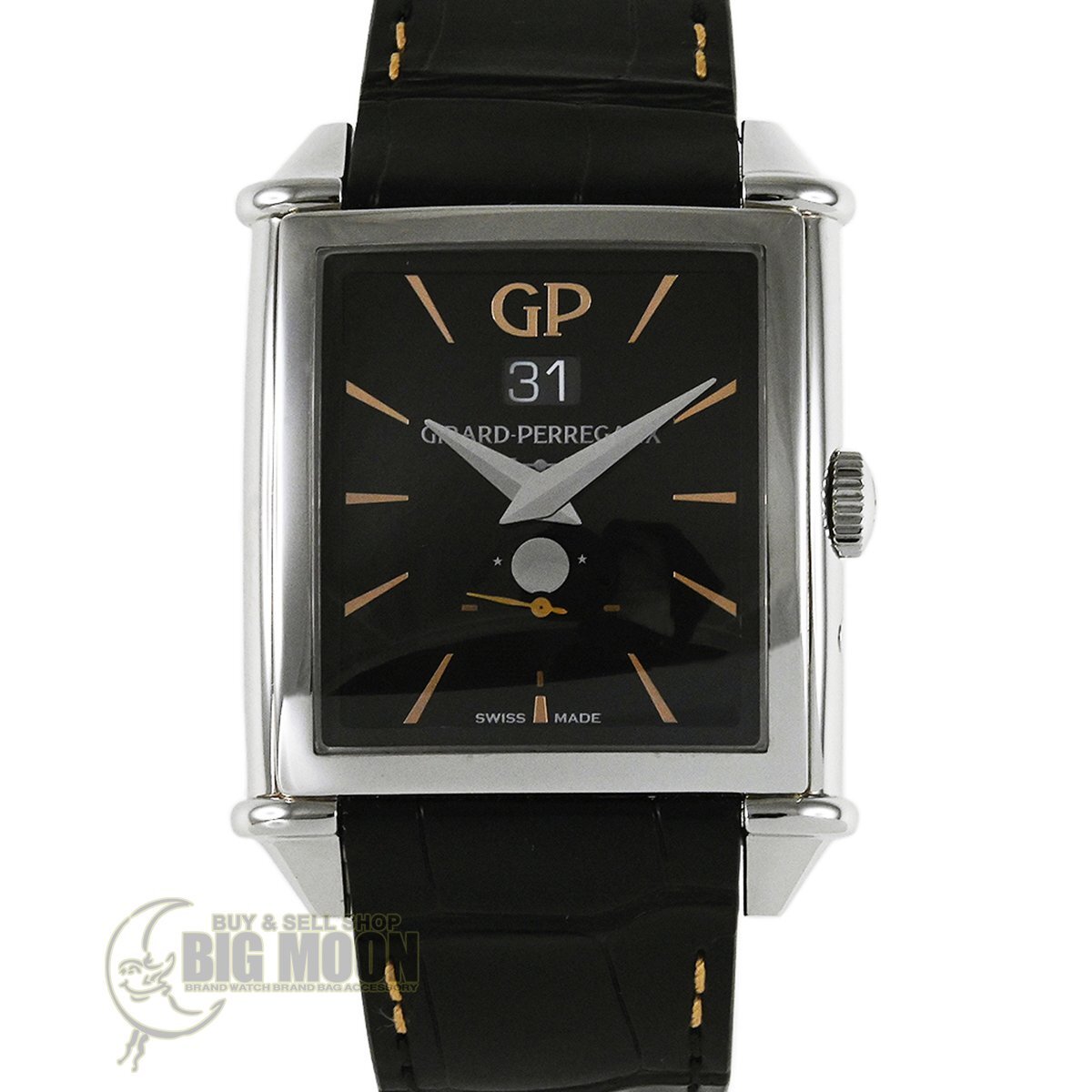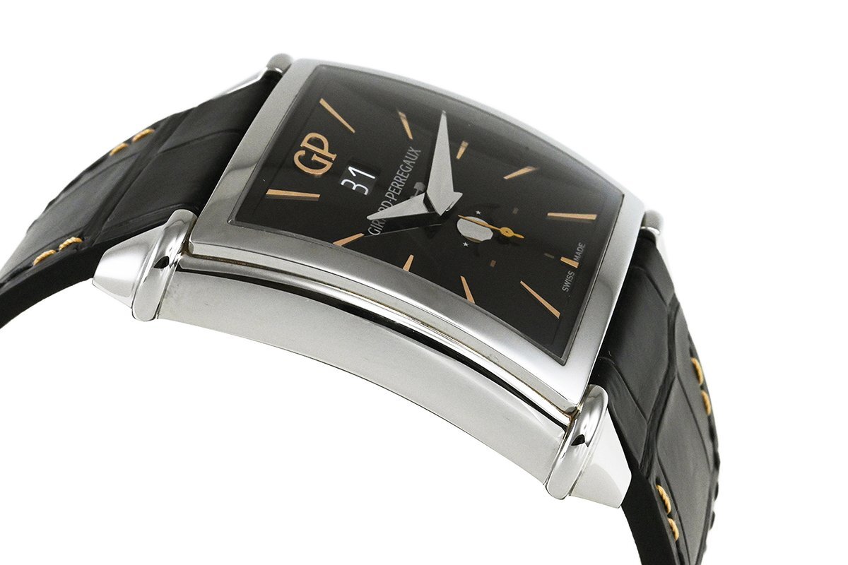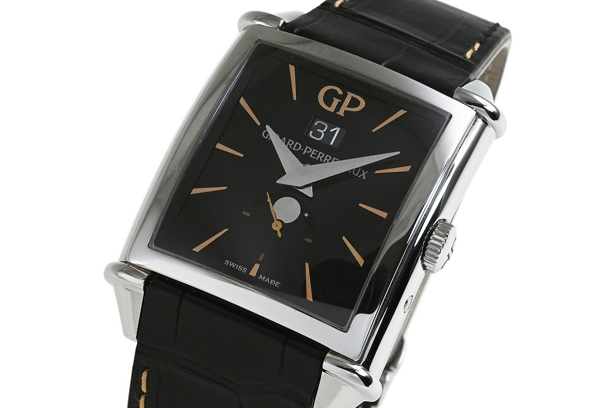 【コメント】 優れた機能性と品質、現在もマニュファクチュール(自社一貫生産)という伝統を貫く老舗ブランド「ジラール・ペルゴ」。1945年に製作されたレクタンギュラーケースを復刻した緩やかなカーブを描くケースが特徴の「ヴィンテージ 1945」コレクション、ビッグデイト、ムーンフェイズ搭載モデルです。艶やかなオニキスブラックダイアルが印象的です。僅かな軽い擦りキズはありますが目立つ様な深いキズはありません。ガラス中央付近に極僅かな擦りキズが数か所あります(視認性に影響ありません)。革ベルトは軽いDバックルの留め痕はありますがキレイな状態です。2024年8月に国内正規店にて購入品で、現在精度は平置きで日差+10秒程です。