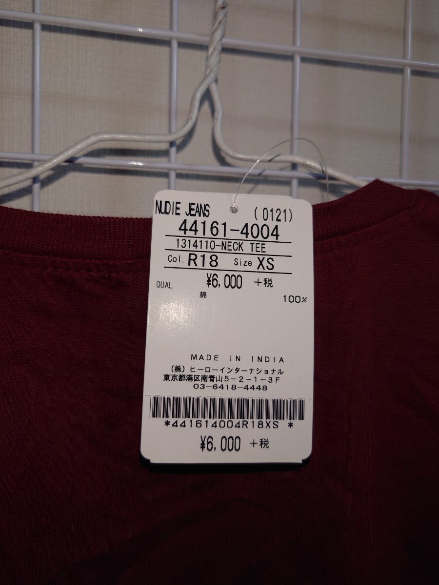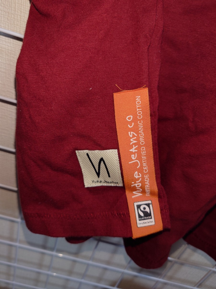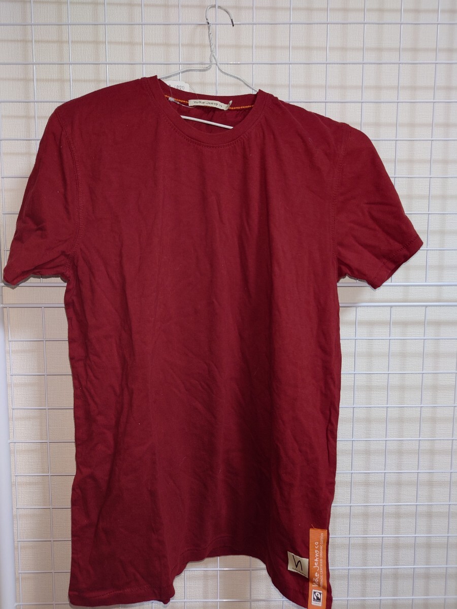 ヌーディージーンズの半袖Tシャツ。色は赤。