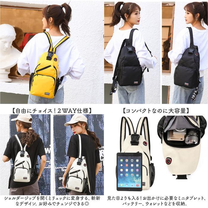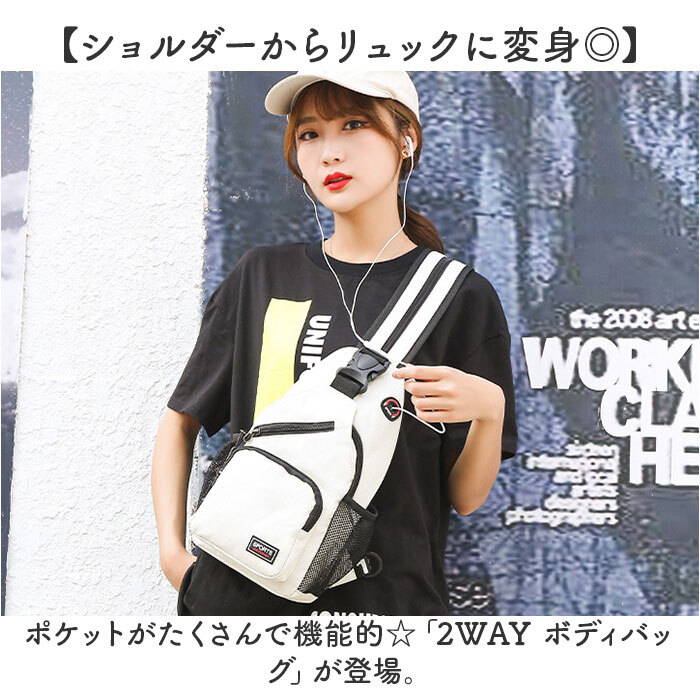 商品説明 | ・・【ショルダーからリュックに変身◎】 ・ポケットがたくさんで機能的☆「2WAY ボディバッグ」が登場。 ・【自由にチョイス!2WAY仕様】 ・ショルダージップを開くとリュックに変身する、斬新なデザイン。お好みでチェンジできる◎ ・【コンパクトなのに大容量】 ・見た目よりも入る!お出かけに必要なミニタブレット、バッテリー、ウォレットなどを収納。 ・【充実のポケット仕様で使いやすい】 ・サイドポケットX2にフロントに小物ポケットを3つ装備。多数のポケットを搭載で整理整頓◎ ・【イヤホン穴付でスマートに収納】 ・イヤホン穴付きで、音楽を聴きながら♪充電しながら♪お出かけがスマートに。 ・【スポーティーデザインがトレンド☆】 ・いつものコーデにプラスすれば、一気に垢抜けて今っぽさがUP♪韓国風スタイルがお好きな方へ。 ・【ユニセックスで使えるのがポイント】 ・男女問わず似合うアイテムなので、家族やカップル、お友達と共有したりおそろにするのも◎ ・【ポケット仕様】 ・フロント:オープンポケット×1、ファスナーポケットX2 ・メイン収納:ファスナーポケット×1 ・サイド:オープンポケットX2 |