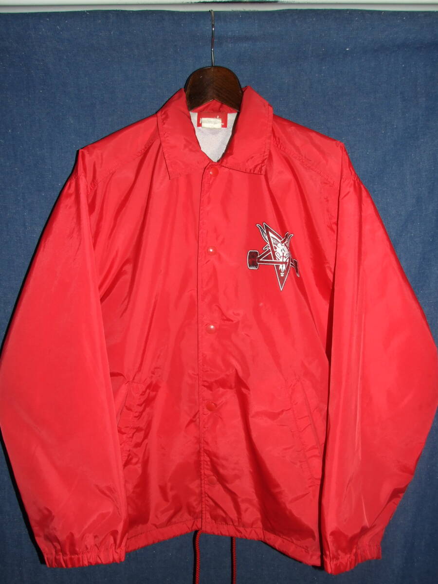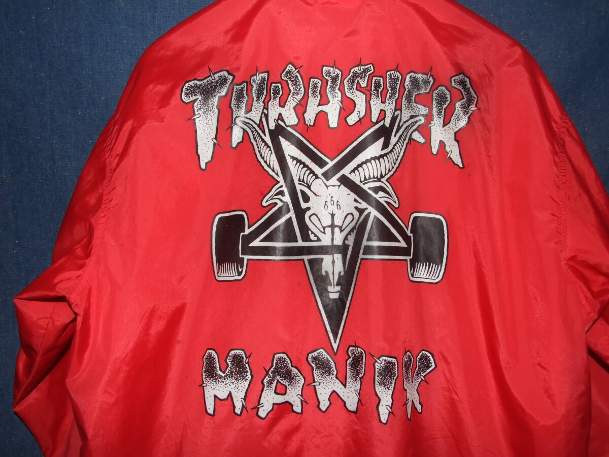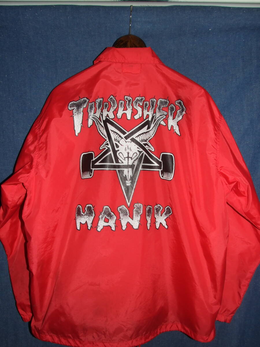 Manik×THRASHER/マニック×スラッシャーのコーチジャケット、着用品です。表記サイズはM,実寸着丈71/肩幅53/袖丈58/身幅63程でした。ユーズド品ですのである程度の使用感はございます。裏地に汚れございますが外観とびぬけて目立つような大きなダメージはございませんので、お好きな方がいらっしゃればどなたか使って下さい。