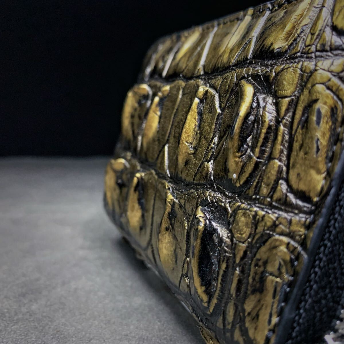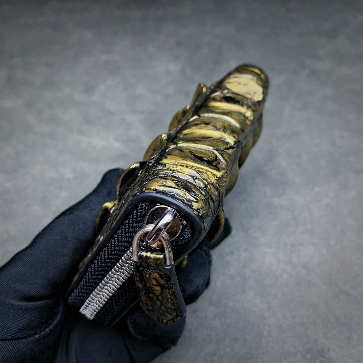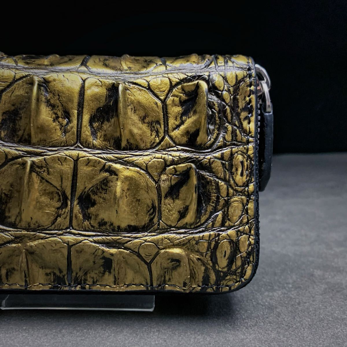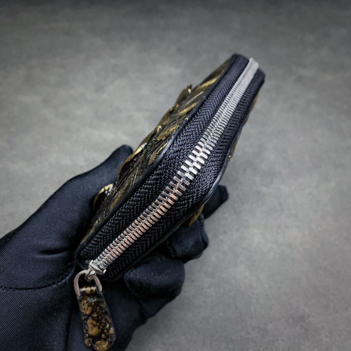 クロコダイル 財布(ラウンドファスナー/センター部位/ハンドメイド/小銭入れ/カードケース/本ワニ/ゴールド染め/ミドルウォレット/実物)
