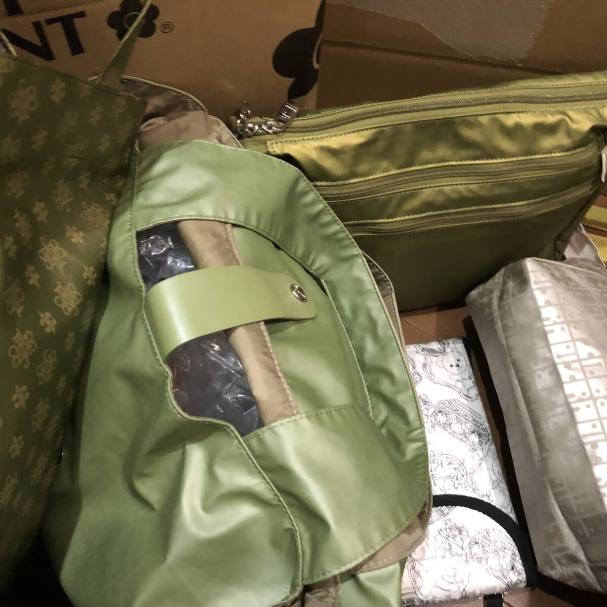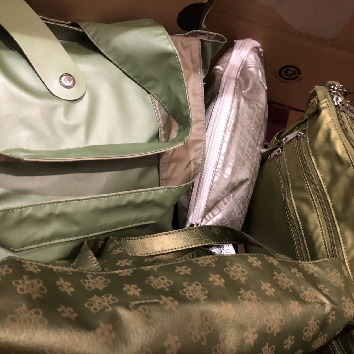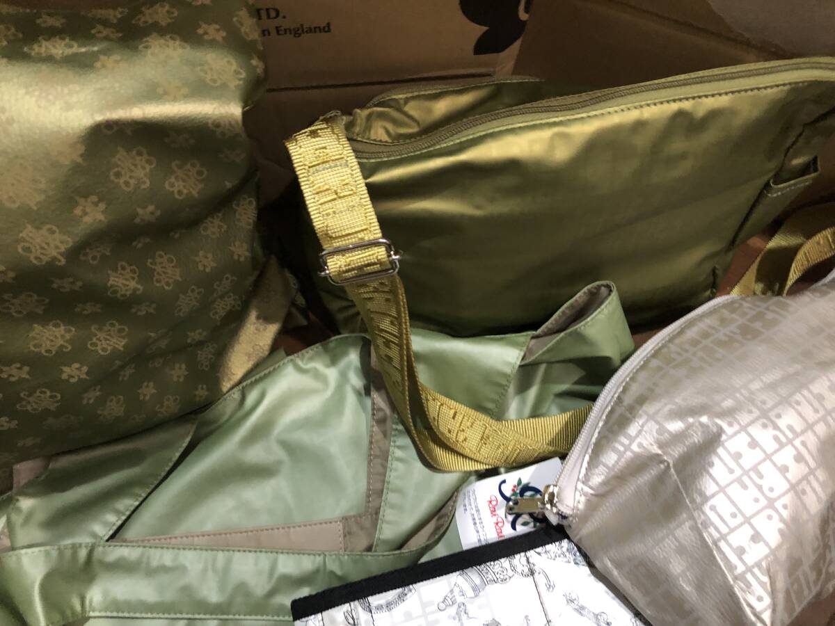 通販サイトで人気のあった伝説の撥水、軽量、丈夫な便利バック、ヤマト屋さんの希少色ピスタチオ系の角ポシェット1点、グリーン色の大きめエコバッグ1点、超希少の利休色のミニトートバッグ1点、プラチナ色の大きめポーチ1点、ホワイト色テディベア柄の携帯入れ1点の全部で5点になります♪