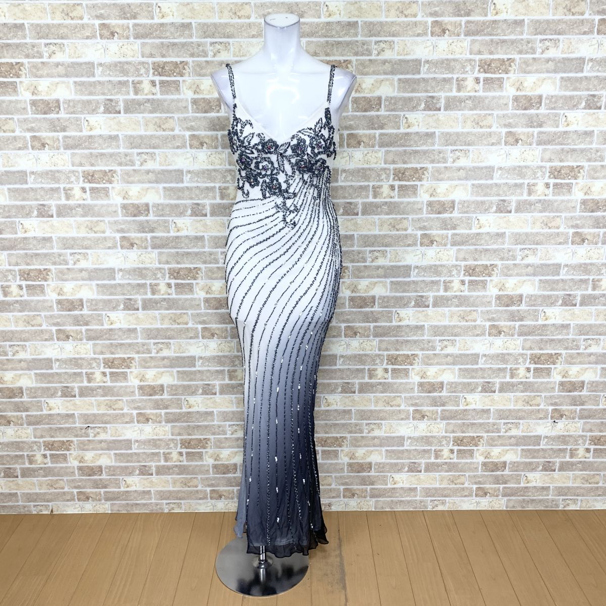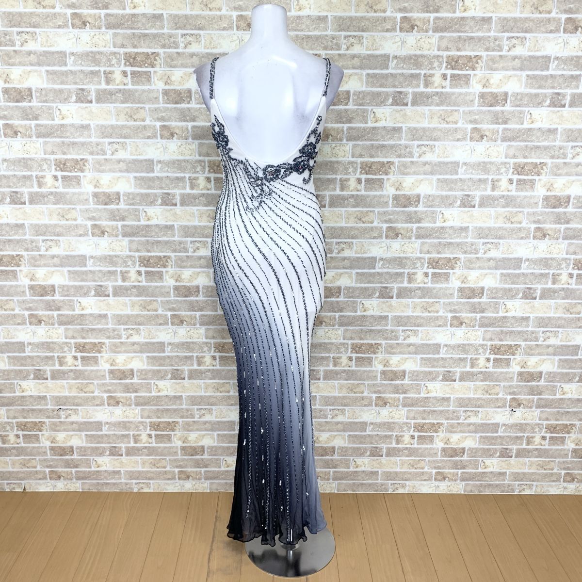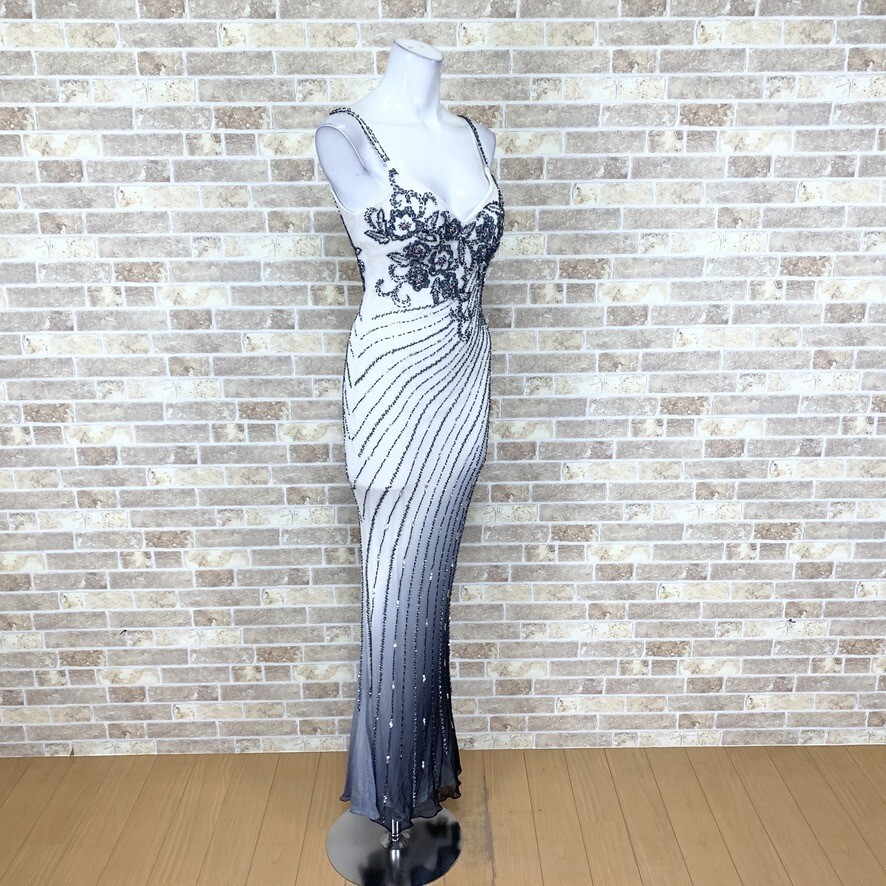 1円 ドレス sugar ロングドレス S 白グレイ グラデーション SILK 100% パーティードレス キャバドレ 中古14668