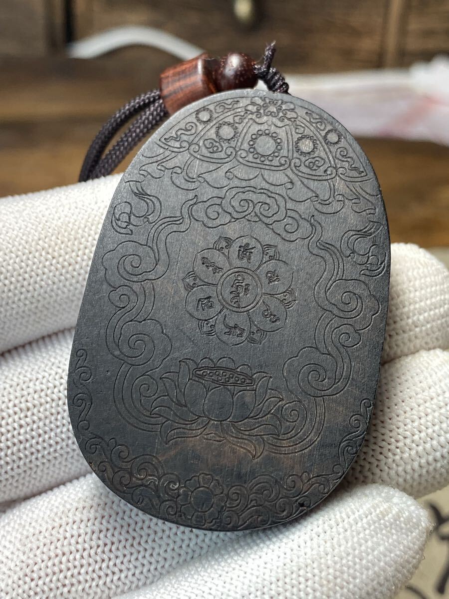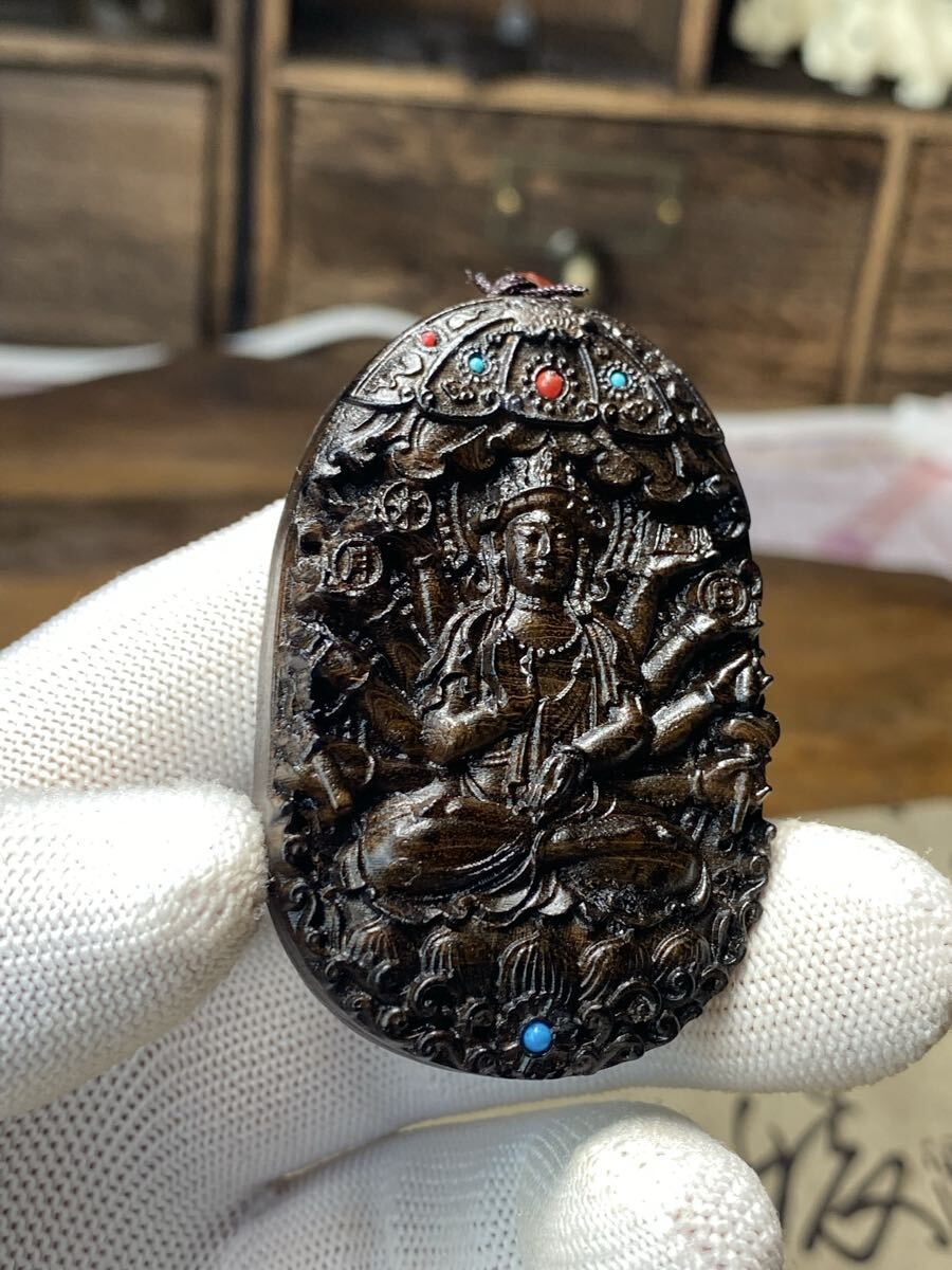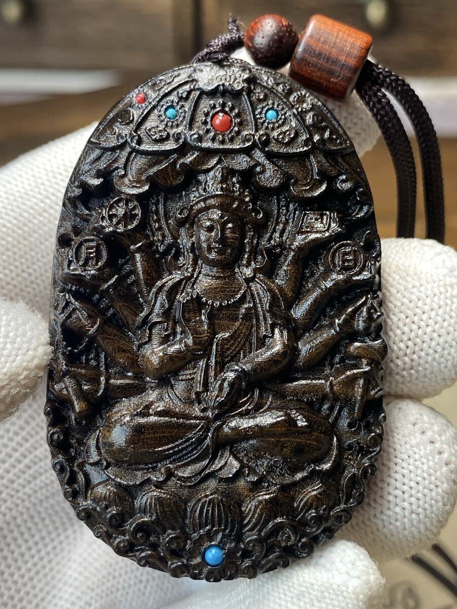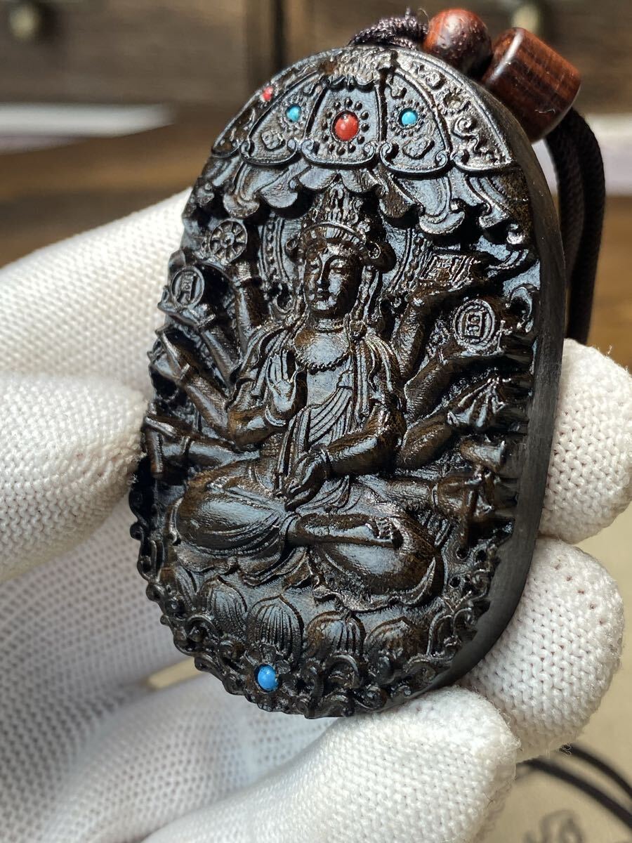 古美術 千手観音 細密木彫 繊細彫刻 観世音菩薩 観音様 お守り 仏教美術 ご本尊 高さ6cm 根付 ストラップ ネックレス