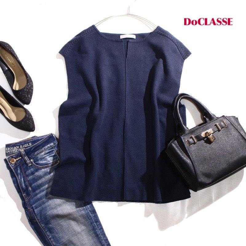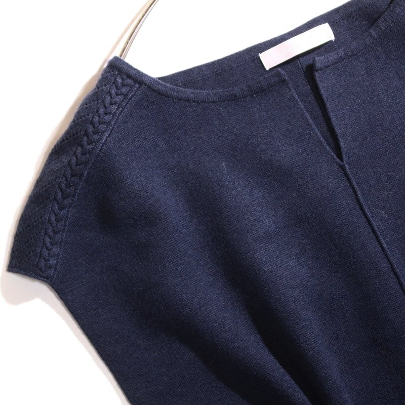 美品 DoCLASSE ドゥクラッセ 合物 秋 ミセス ロング丈 ノースリーブニット ニットカットソー L ネイビー 紺 チュニック プルオーバー 上品