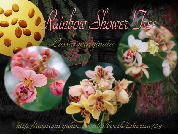 こちらの種子在り天然レインボーシャワーツリーCassia marginata rainbowは、白、黄色、オレンジ、ピンク、ローズレッドへとそれぞれの花が時と共に変化する様がまるで虹色の雨が降り注ぐように美しいmarginataの多色種です。また、ビロードのように繊細な毛に覆われた羽状複葉も魅力的です。