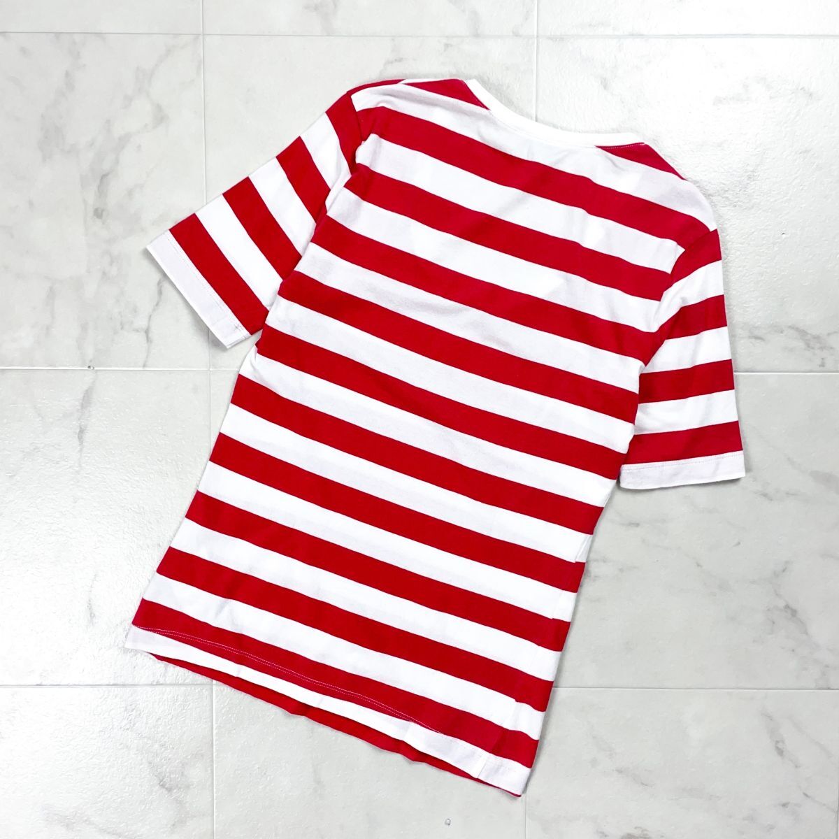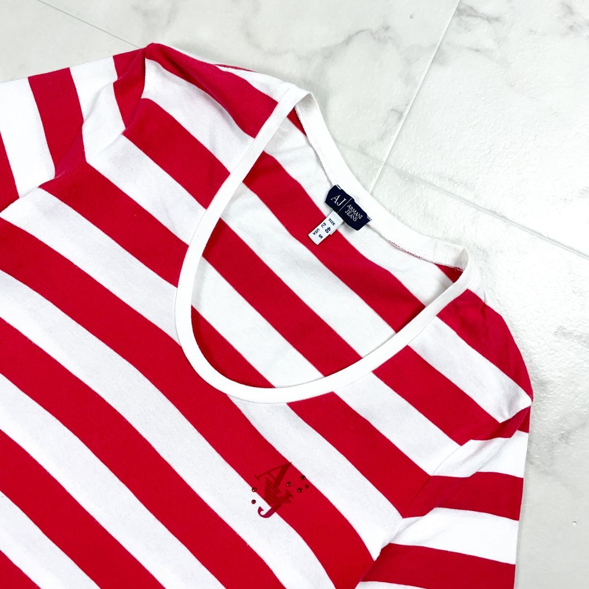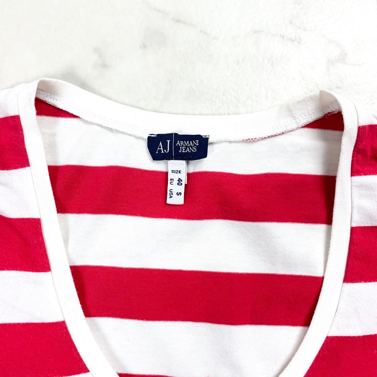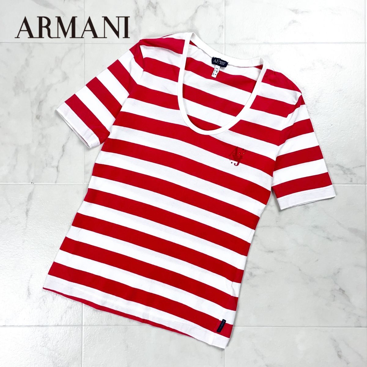ARMANI JEANS アルマーニジーンズ 深UネックボーダーTシャツ ワンポイントロゴ トップス レディース レッド 赤 サイズS*FD1120