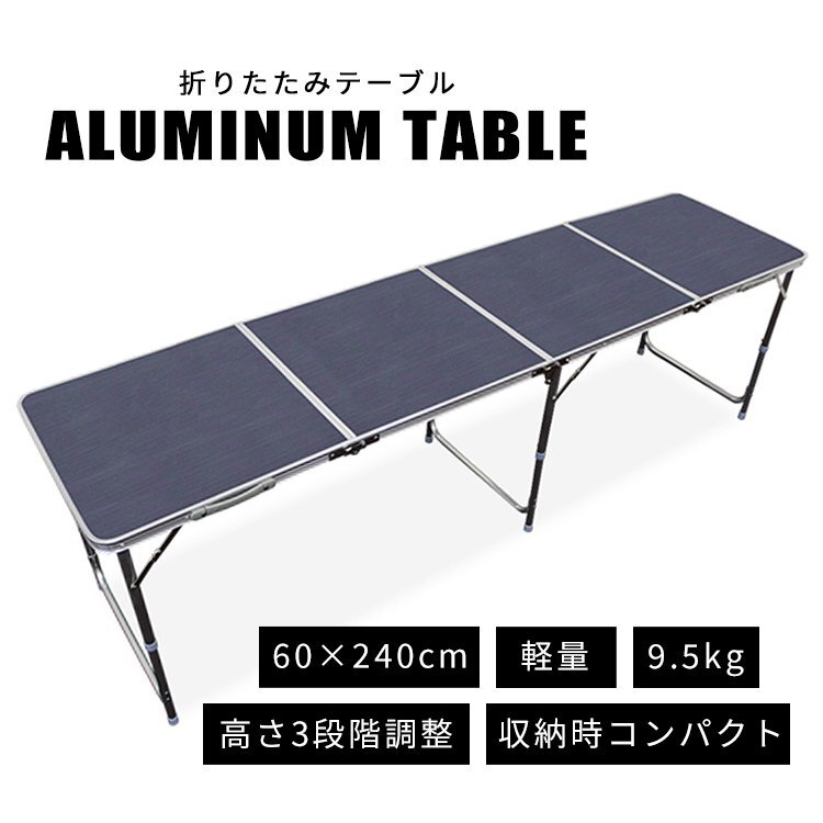 広々サイズの240cm×60cm!! サビに強いアルミを使用! 天板には防水加工が施されています。 必要のない時は折りたたんで収納できる!! 取っ手付きで持ち運びもラクラク♪ 高さは「ハイスタイル」「ロースタイル」の2段階調節。 付属の脚ジョイントを使用する場合はハイスタイルとして、 脚ジョイントを使用しない場合はロースタイルとして、 使用することができます。 お好みや用途に合わせて使い分けることができる嬉しい仕様♪ キャンプ、バーベキュー、お花見などにとても便利! 【商品仕様】 ・折りたたみ式 ・カラー:ウッドグレー ・使用時サイズ(約):縦60cm×横240cm×高さ70cm/40cm ・収納時サイズ(約):縦64cm×横63cm×幅16.5cm ・重量(約):8.5kg ・材質:アルミフレーム、スチール、合板 |