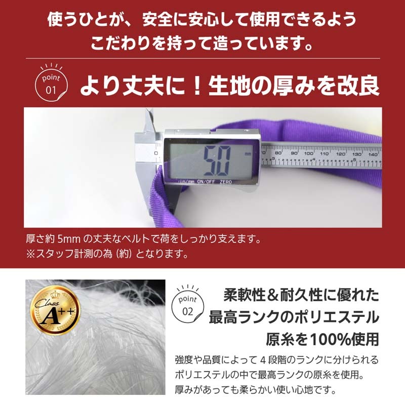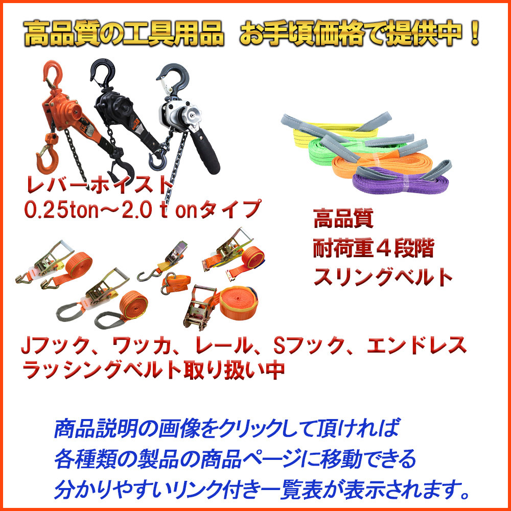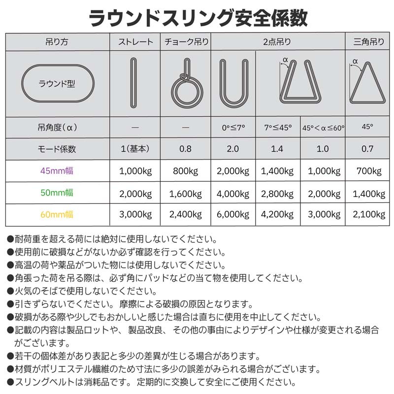 | ピアノ・オルガン・家具・庭石・植木庭木・石材加工品・墓石・彫刻作品などの吊り上げ・移動・運送・運搬、山林業や果樹園での原木搬出・抜根・杭抜作業、景石・柱石・ヒューム管などの据付作業。 ソフトスリングのように柔らかくベルトスリングより幅広で、優しくしっかりと安定した作業が可能なエンドレススリングです。 ・ベルトサイズ:幅45mm×長さ4m(全周囲8m) ・最大使用荷重:ストレート吊1000kg、チョーク吊800kg ※安全係数7:最大使用荷重×7=破断荷重 ・材質:ポリエステル100% ・製造国:中国 ・PL保険加入商品、欧州CE規格+GS&TUVマーク取得商品 ※商品改良の為、仕様・外観は予告なく変更する場合があります。 |