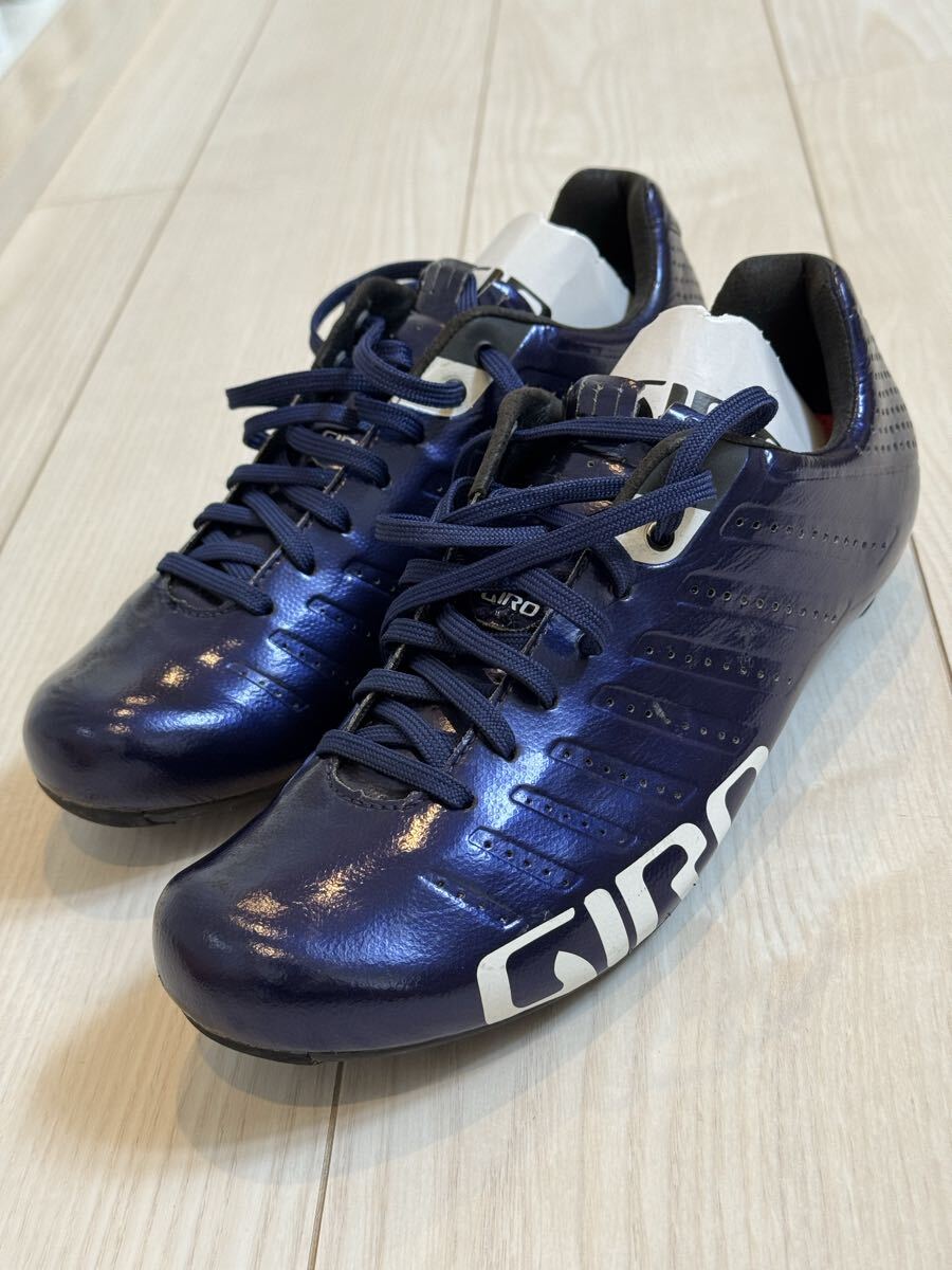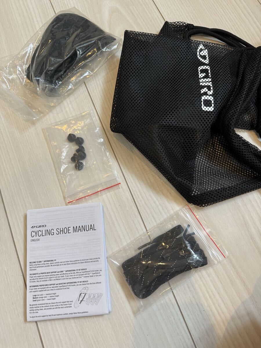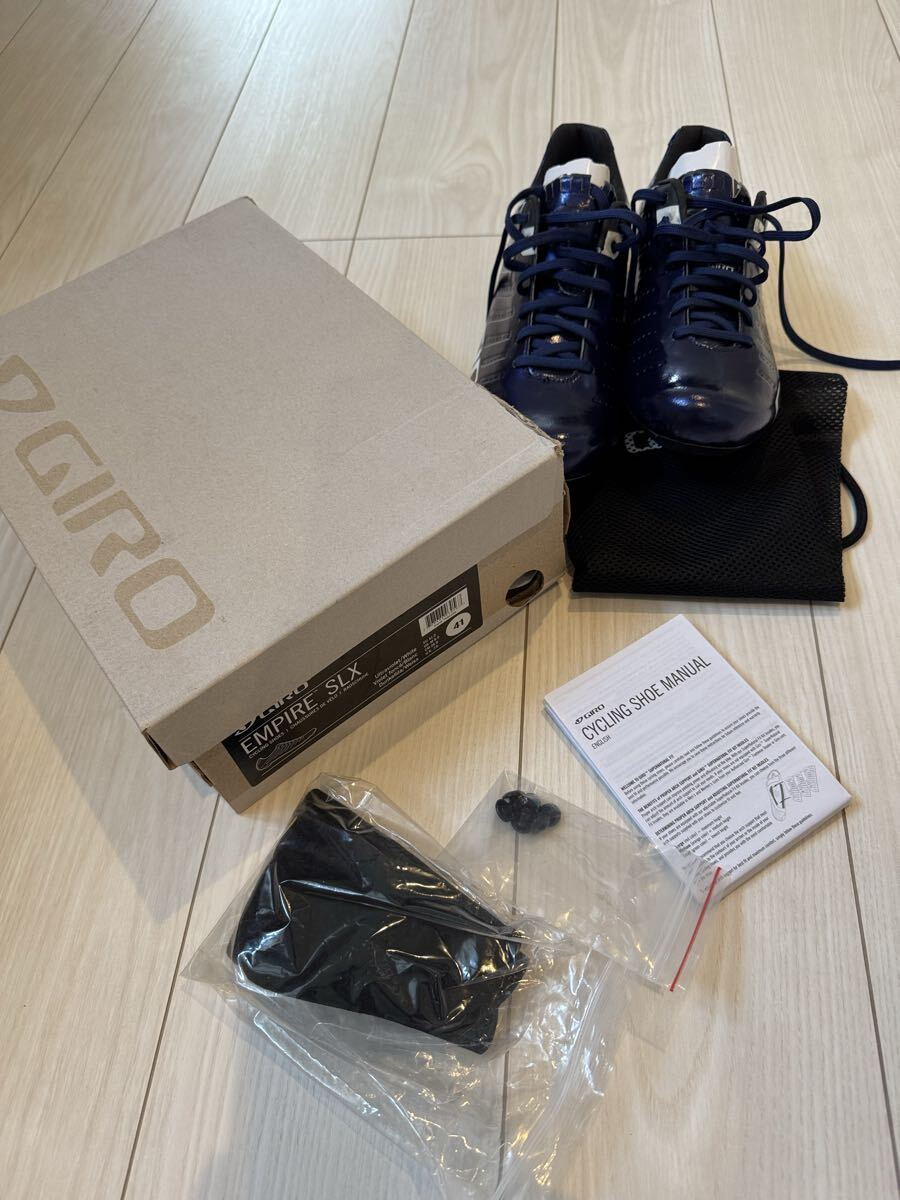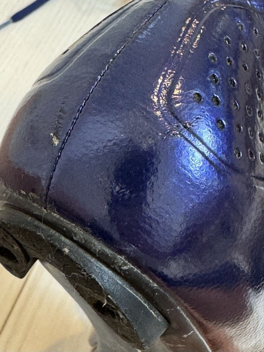 ジロの軽量カーボンソールのサイクリングシューズの中古品です。紐で締め付けるため、細かなフィッティングが可能です。カラーはバイオレットのメタリックで、とても綺麗です。商品の特性上、どうしても使用に伴って傷がついてしまいますが、目立つ部分は画像に収めましたので、ご確認ください。中敷きは、別のものを使っていましたので、使用していません。購入時の付属品も揃っていますので、こちらも画像にてご確認ください。サイズは41ですが、ジロは細めのフィットとなりますので、他メーカーの40.5くらいとの比較になると思います。シューズが増えてしまい、あまり使用する機会がないため、出品いたします。宜しくお願いいたします。