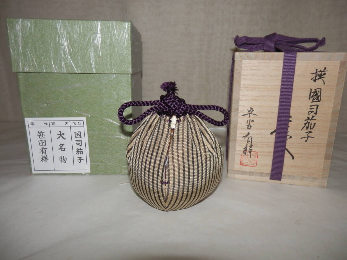 「新品・茶道具」 平安陶工の笹田有祥さんの唐物大名物写の茶入です。 国司茄子です。 壷の径約6.9cm 高さ約5.9cm 蓋径約2.9cm 『仕服複製:国司間道・緒つがり・紫 』 桐共箱。 どうぞ宜しく。 『伝来 国司 北畠~松花堂昭乗~酒井家~藤田平太郎氏~藤田美術館 』