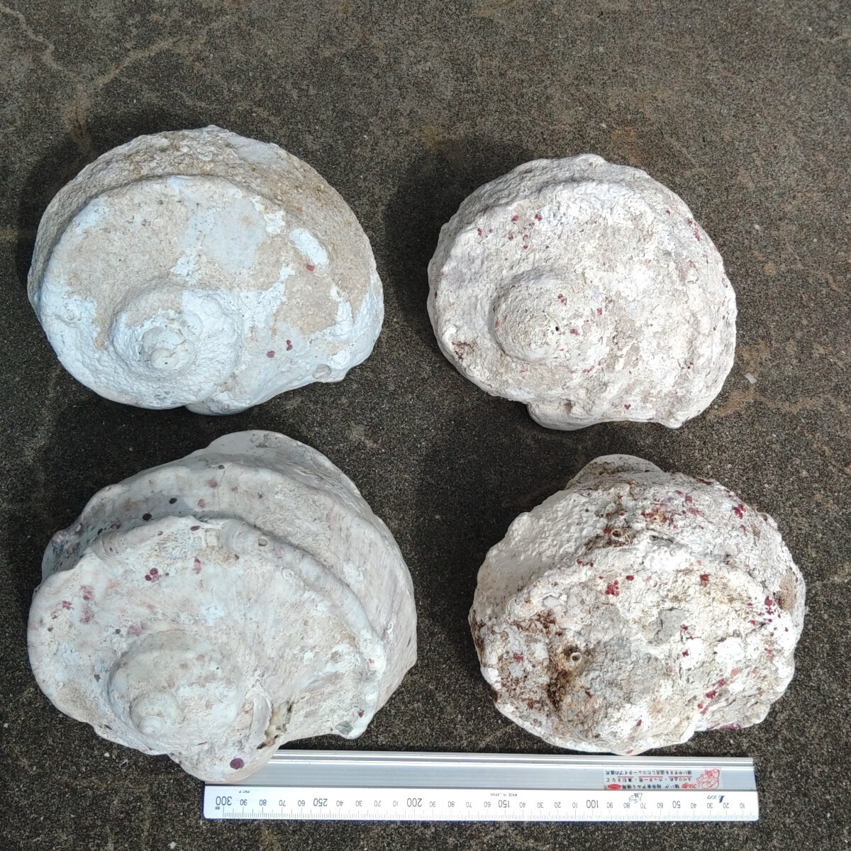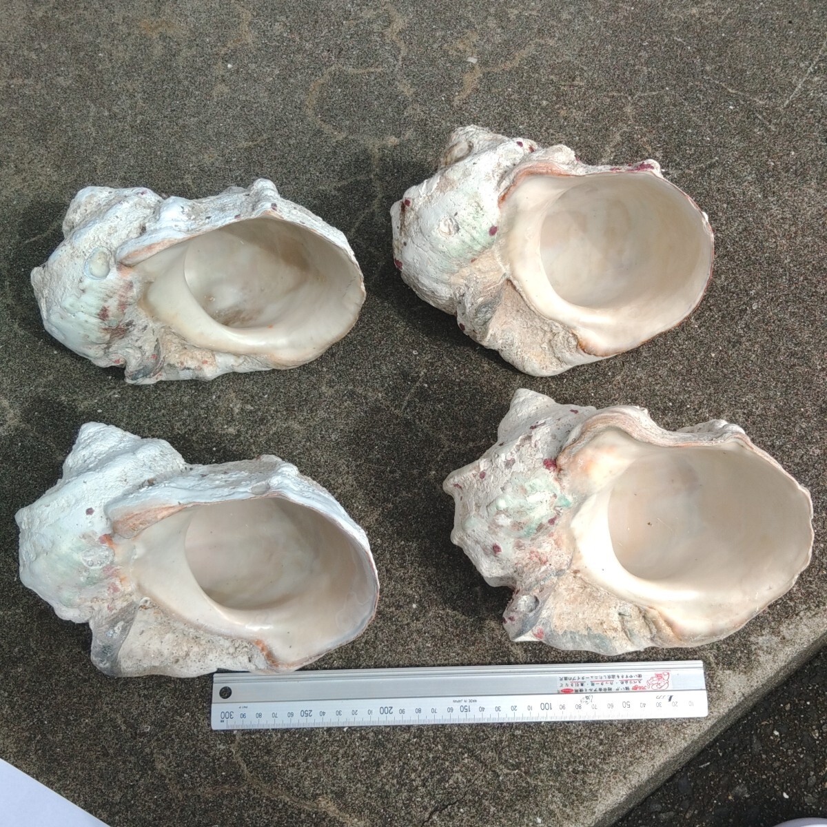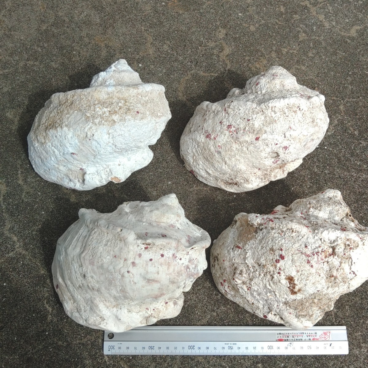 海の中で付着した汚れや貝、珊瑚、他の貝が外れた跡、水圧による気泡、虫食い、欠けなどが普通に見られます。