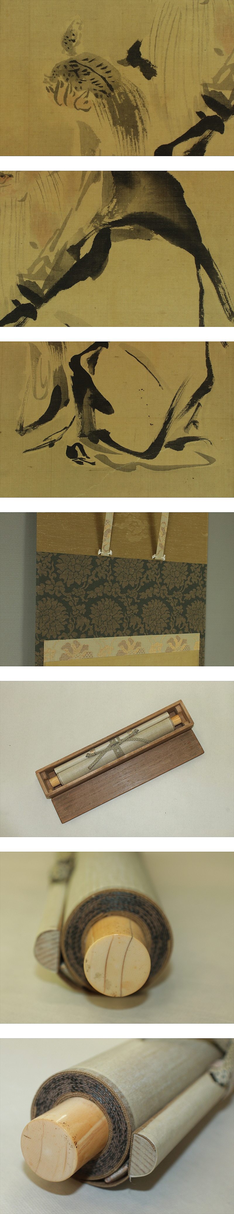 狩野伊川院 かのう-いせんいん(1775-1828) 江戸後期の画家。養川院惟信の子。名は栄信、号は玄賞斎。 絵を父に学び、その父に「吾及ばず」と言わしめた。 近世狩野派の名手。水墨に金泥を施す技法に特色を発揮する。 また茶道を能くし松平不昧の恩顧を受ける。 文化13年法印に叙せられ伊川院と称した。 文政11年(1828)歿、54才。 宙宝宗宇 1760-1838 江戸後期の臨済宗の僧。大徳寺四百十八世。京都生。 宙宝は道号、宗宇は諱、松月老人と号する。 大徳寺四百六世則道宗軌に就いてその法を嗣ぐ。 天保7年仁孝天皇より大光真照禅師の号を賜る。天保9年(1838)寂、79才。 本紙は、染み痕、ヤケがあります。 表装は、改装済みの為きれいです。 【サイズ】 作品 横約28.5cm×縦約78.5cm 表装 横約31cm×縦約155.5cm |