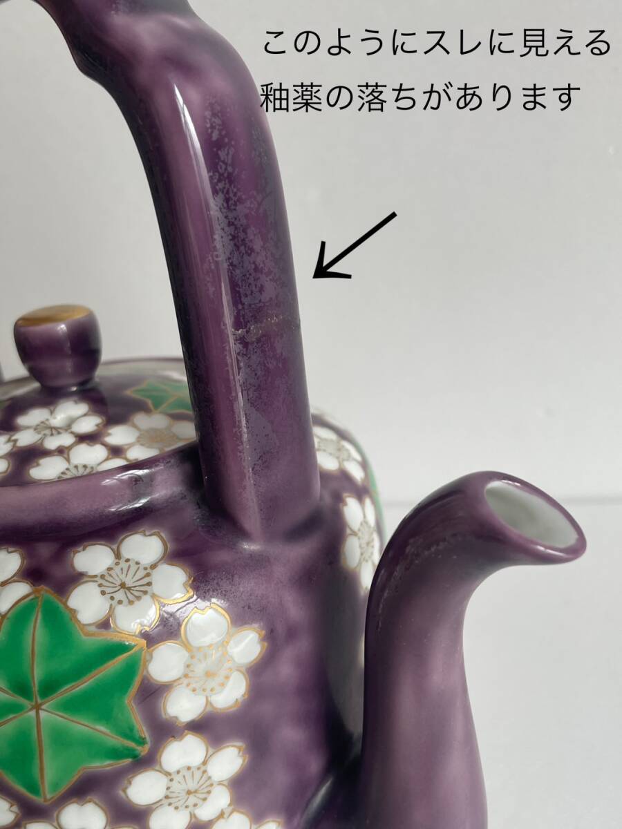 特に取っ手の部分がお写真でわかるように、釉薬のツヤ落ちなのか、スレのように見える個所が複数あります。