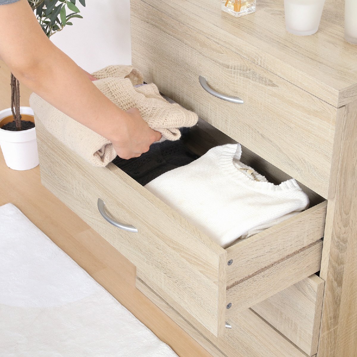 備 考 | ■衣類や下着などの整理タンスにいかがでしょうか。 ■収納力抜群の4段チェストです。 ■おしゃれな木目調カラーです。 |