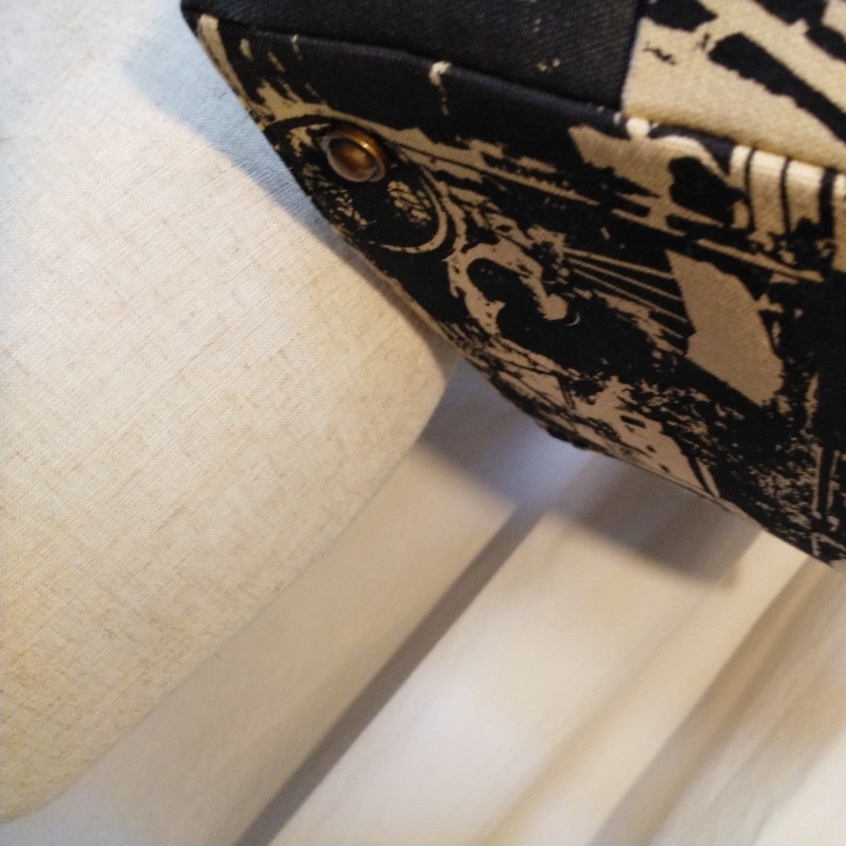 色は落ち着いたブラックで、地の色はベージュ、 コルカタcity柄のプリント。