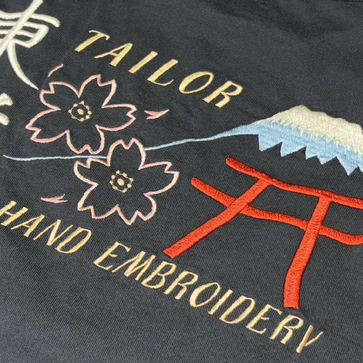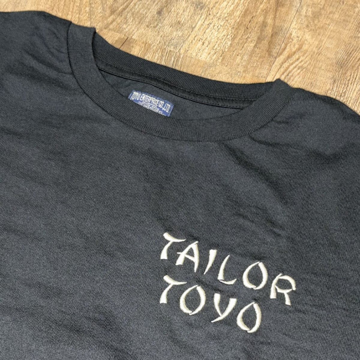 テーラー東洋のロゴを大胆にTシャツへ刺繍した一着。ボリュームのある立体的な刺繍がプリントとは一線を画す、テーラー東洋らしい出来栄え。着用を繰り返すことで、アセテートとはまた異なるコットンならではの風合いが増す。