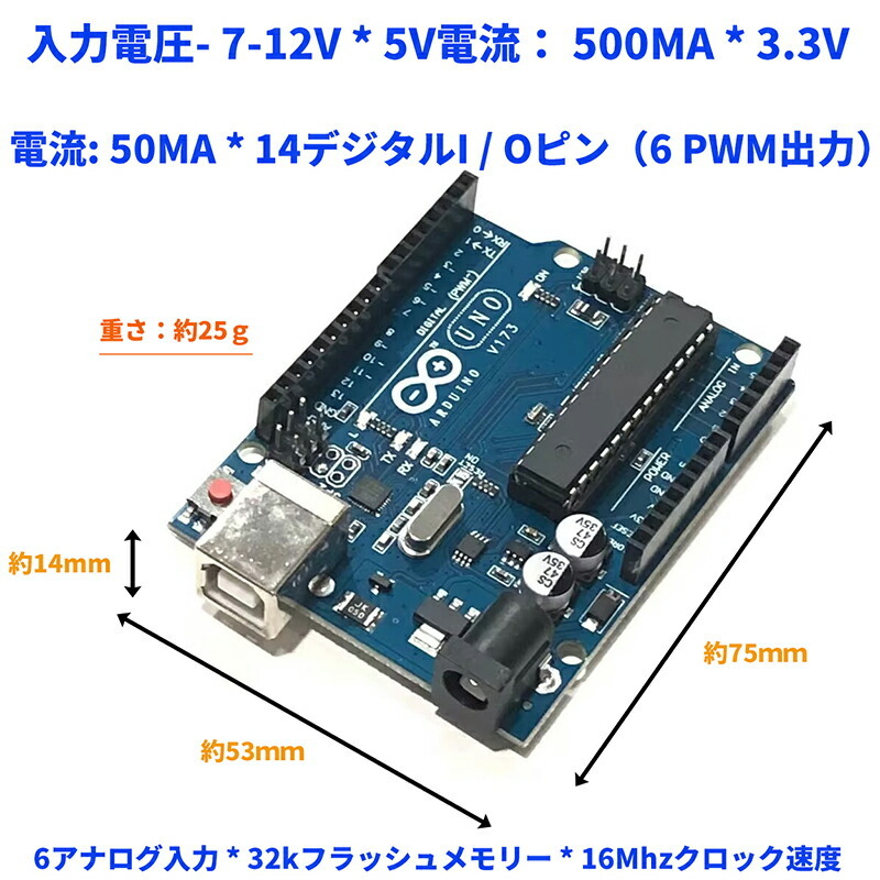 電流: 50mA * 14デジタルI / Oピン(6 PWM出力) 6アナログ入力 * 32kフラッシュメモリー * 16Mhzクロック速度