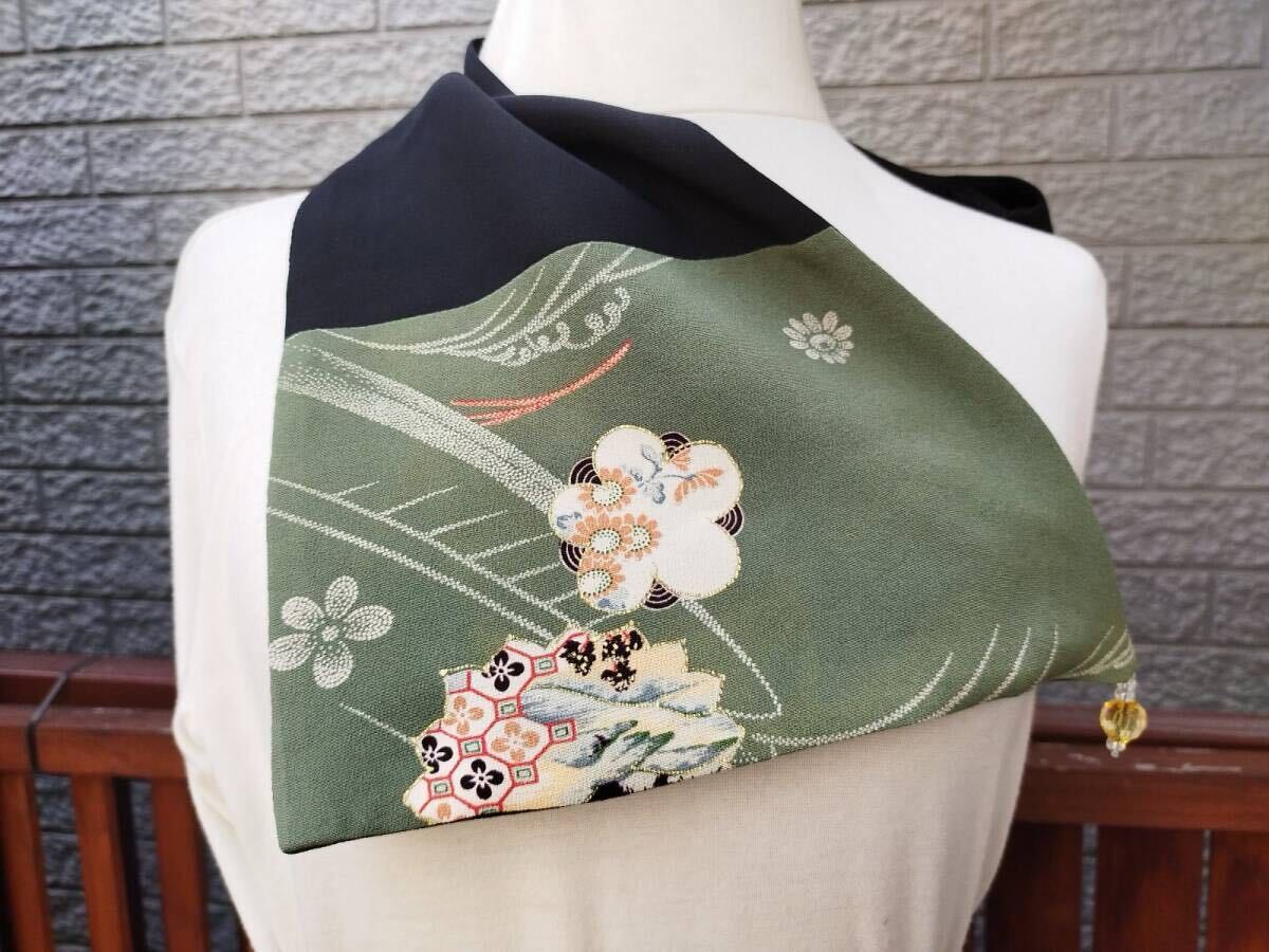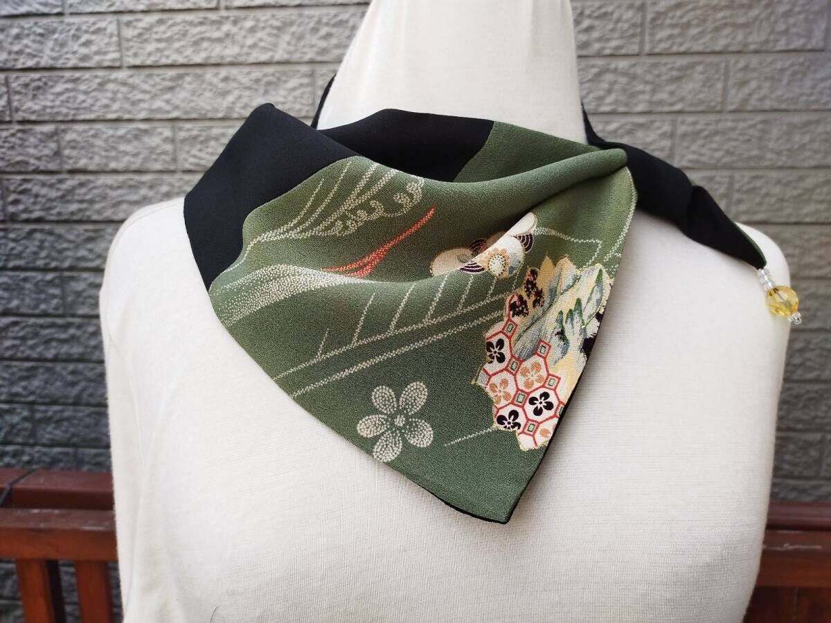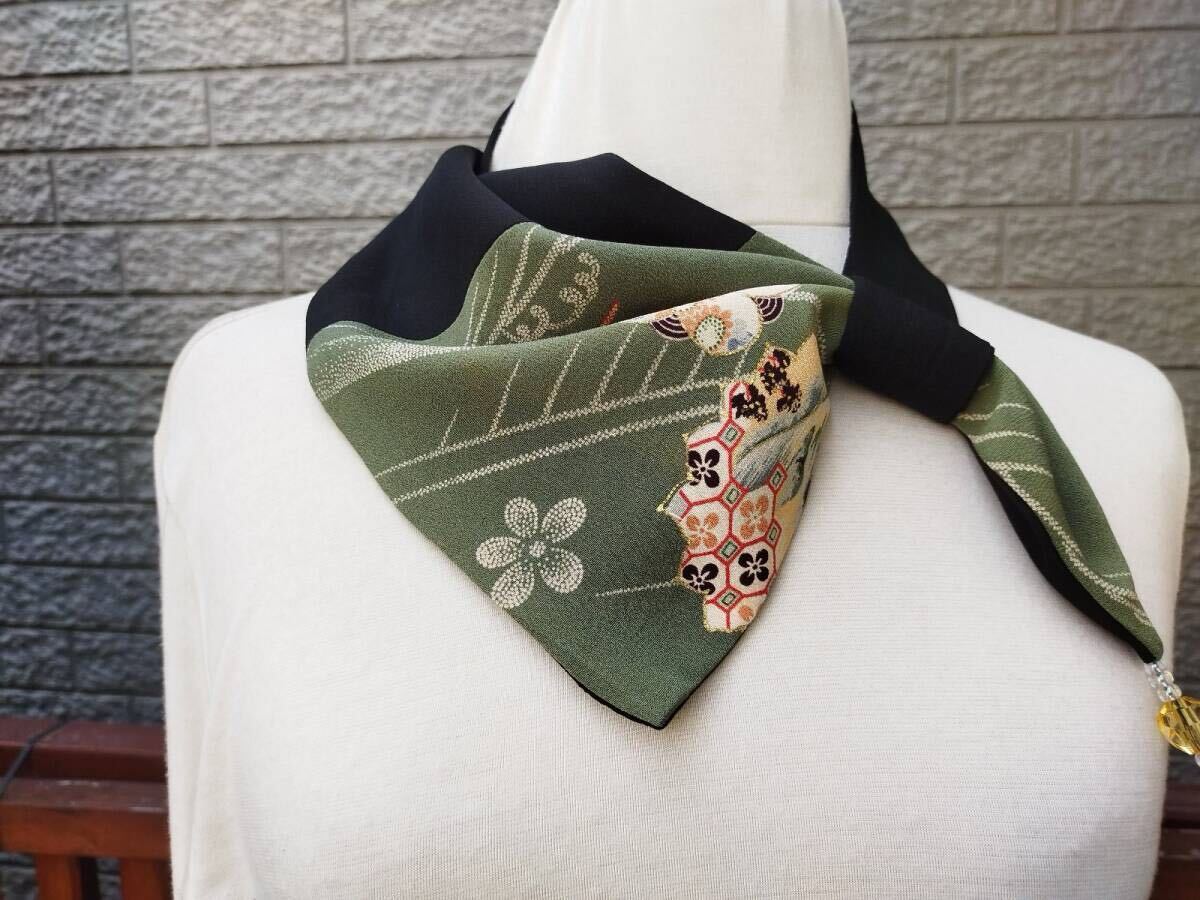 ★アイディアスカーフ 結び方簡単!プレゼント 着物リメイク シルク 縮緬 藤の花模様  シルク ビーズ付き★