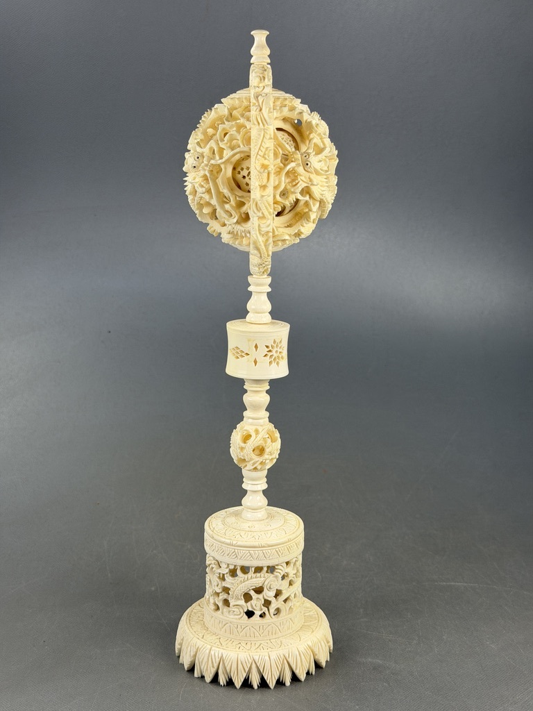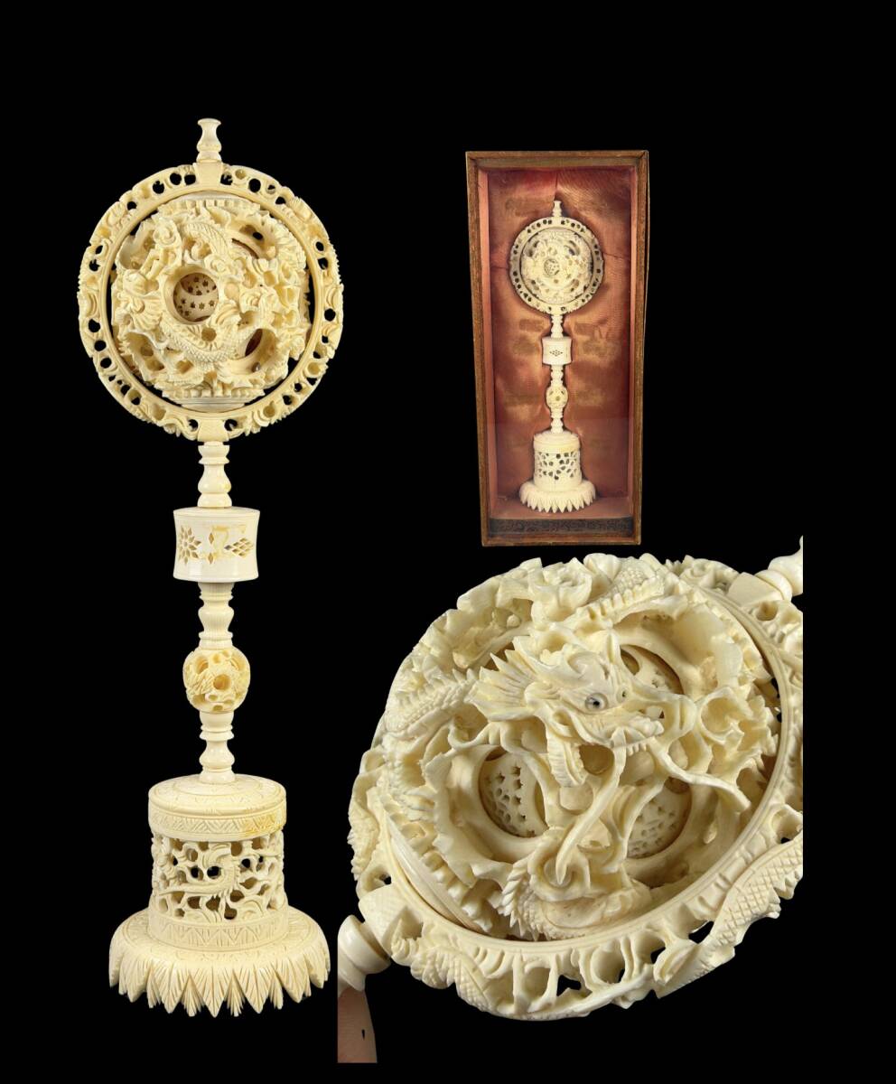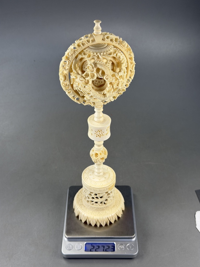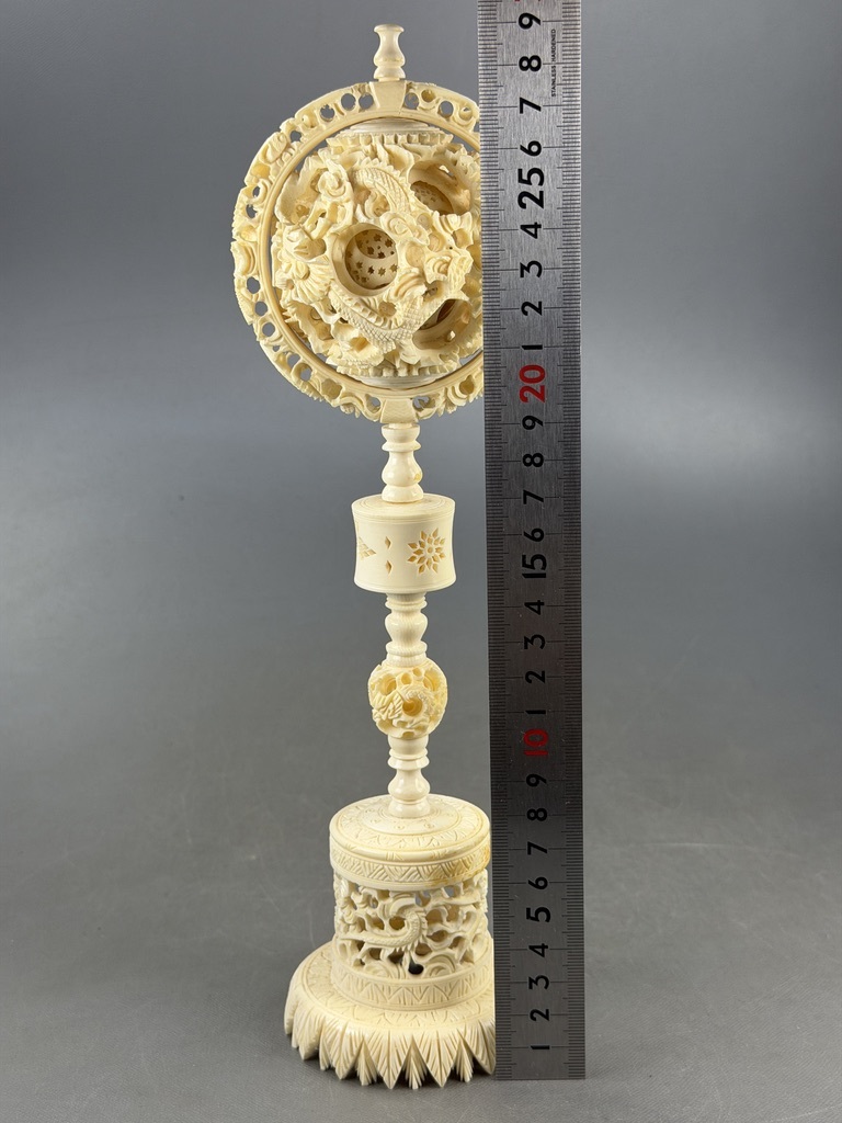 【偲】某有名オークション買入 鯨歯風 天然素材 時代物 雲龍紋天球 置物 骨董品 古美術  重約227.23g   高約29cm   r-890