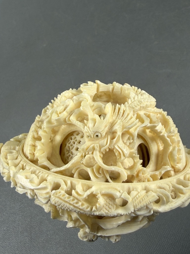 【偲】某有名オークション買入 鯨歯風 天然素材 時代物 雲龍紋天球 置物 骨董品 古美術 重約227.23g 高約29cm r-890