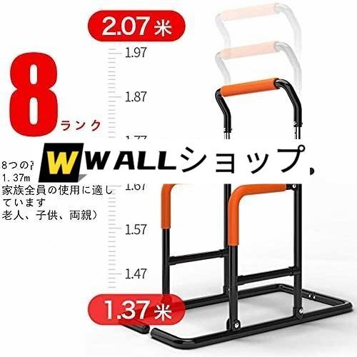 『家族全員が使える鉄棒です』『8段高さ調節可能』 この鉄棒の高さは調節できます。つまみを回すと調節できます。137 cmから207cmまで調節できます。だから、大人も子供も使えます。器具一つで家族全員の運動需要を満たすことができます。