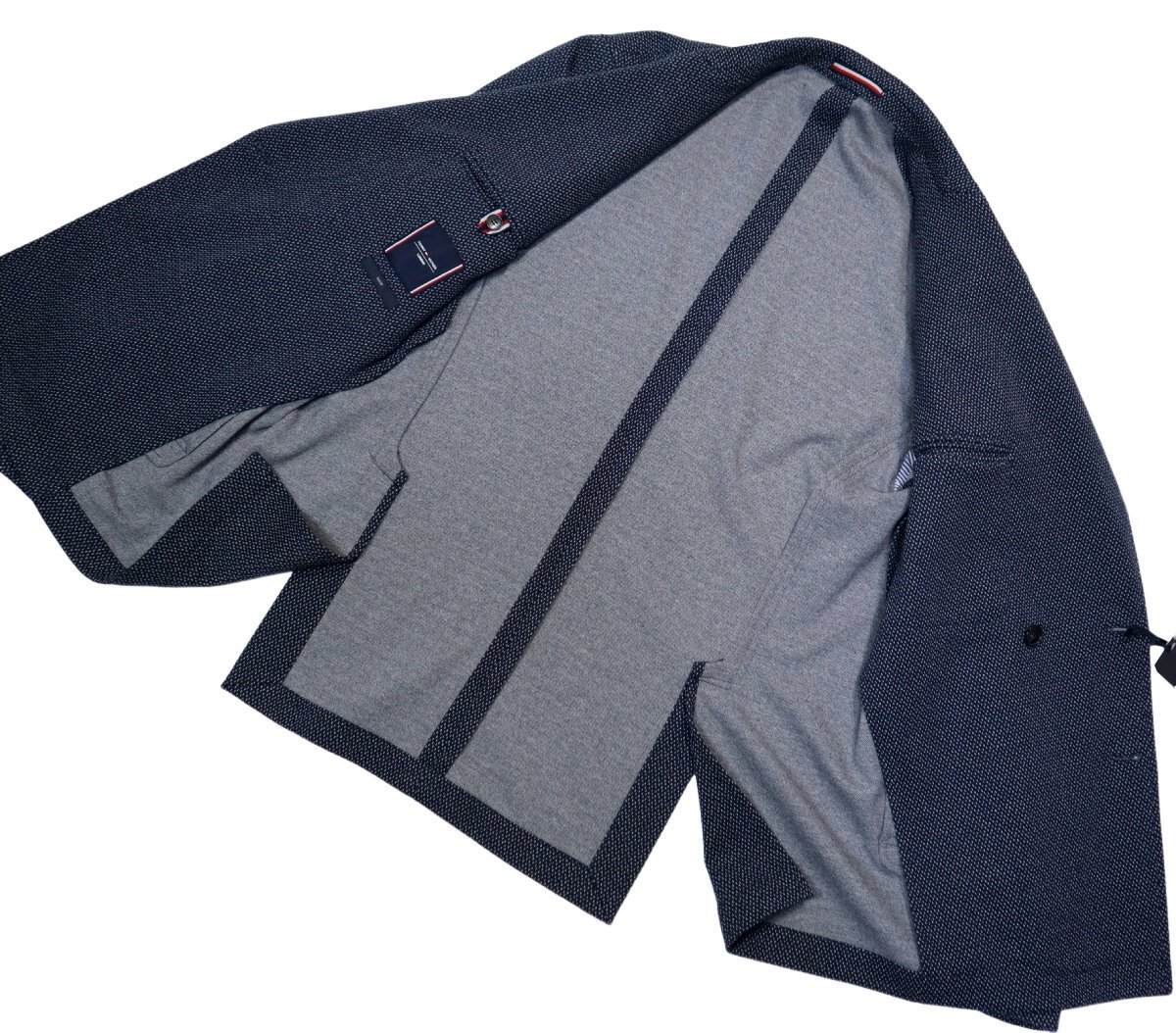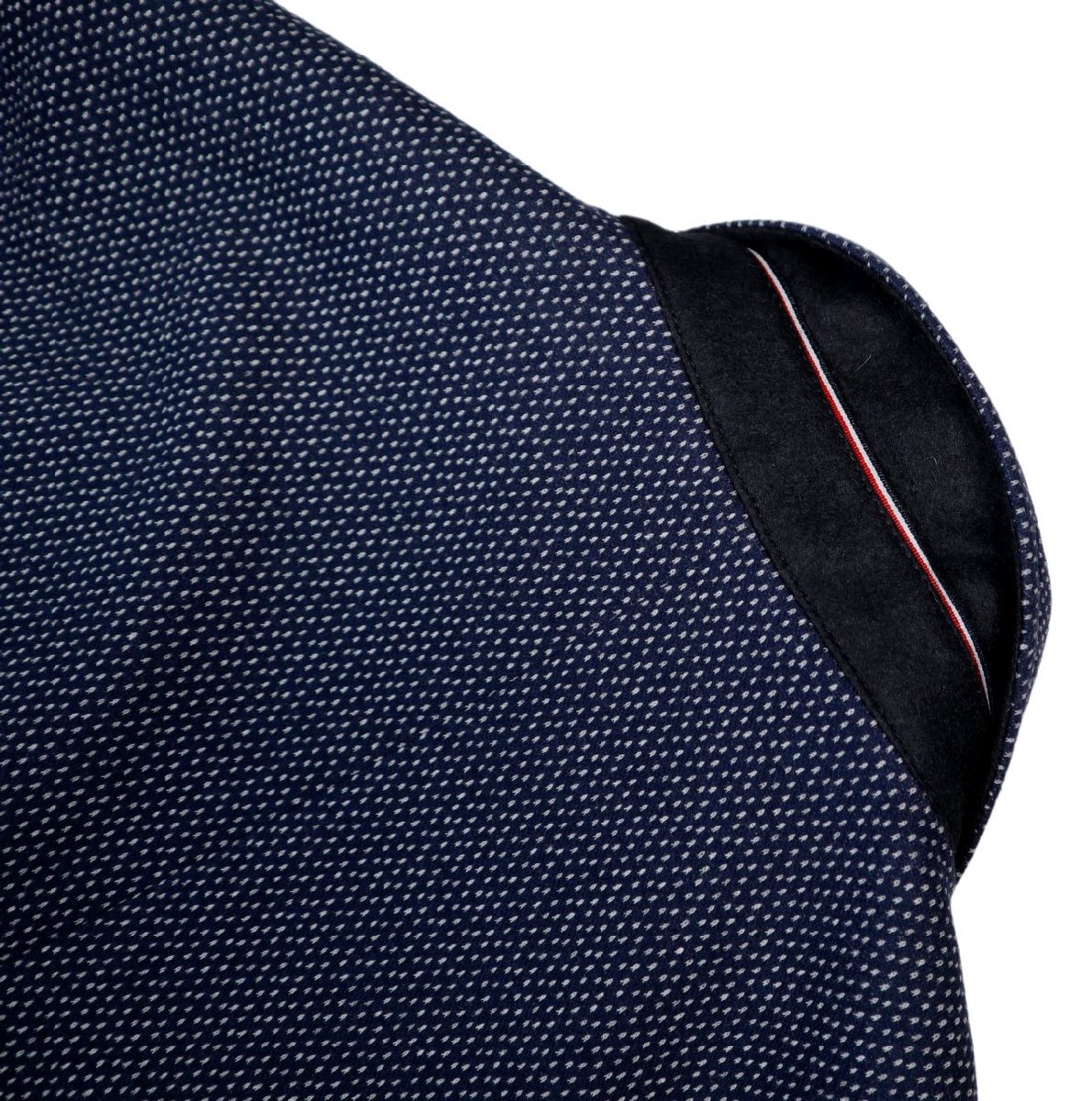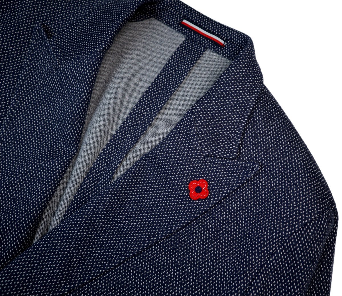伸縮性の高いポリエステル・コットン・ポリウレタンの3種混紡素材を使用した、ネイビー色。ドット柄にも見えますが、よく見るとマイクロな「R」柄に織られています。襟を立てると「トミー・ヒルフィガー」ならではの「フラッグ柄」のパイピングが施されています。ラペルには「フラッグカラー」のスペシャルブートニエールが付属し、洒落感と華やかさをさらにプラスしてくれています!
