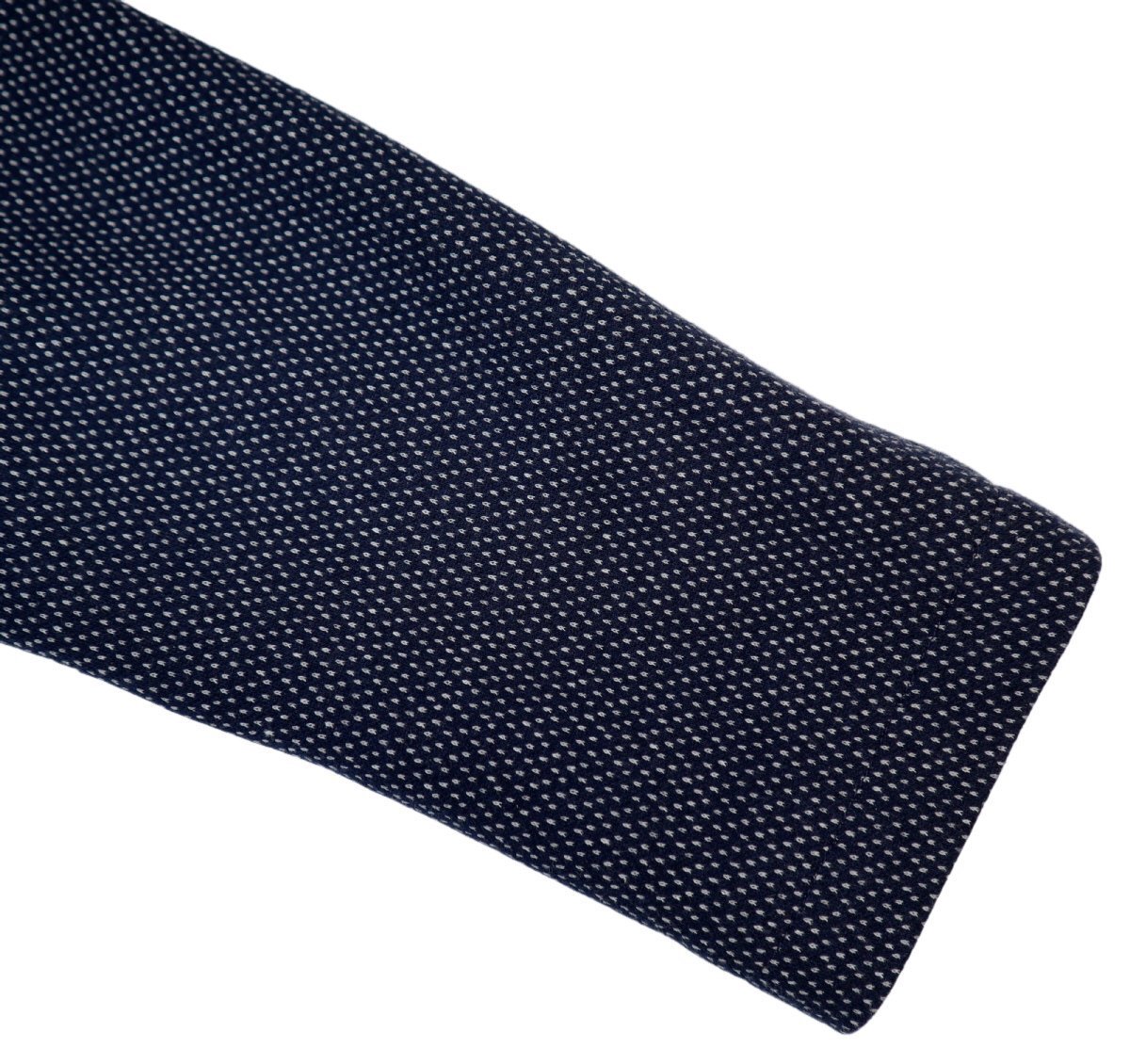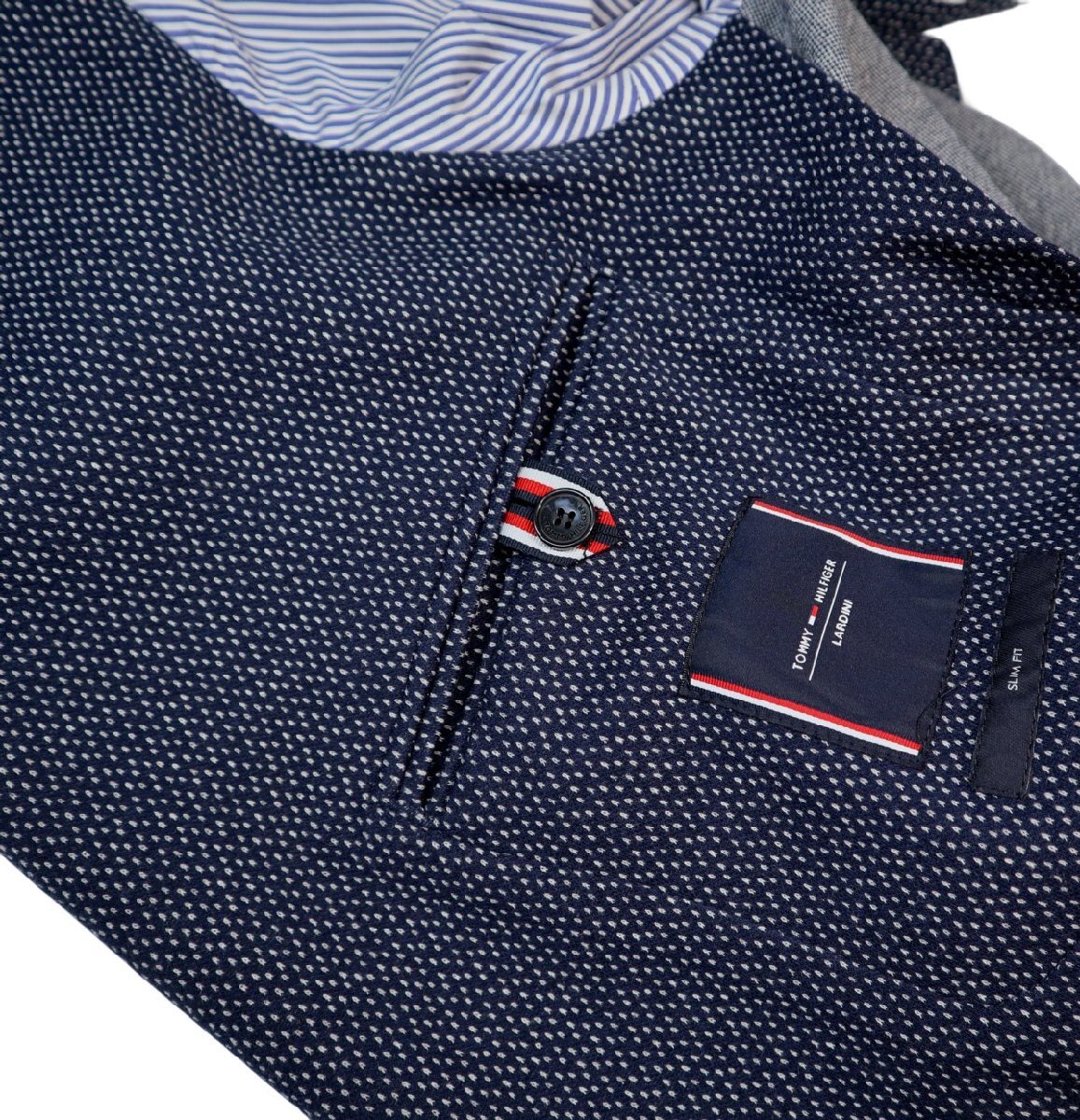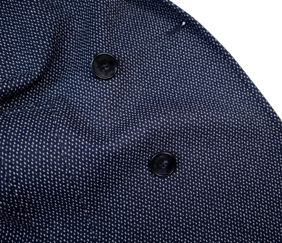 伸縮性の高いポリエステル・コットン・ポリウレタンの3種混紡素材を使用した、ネイビー色。ドット柄にも見えますが、よく見るとマイクロな「R」柄に織られています。襟を立てると「トミー・ヒルフィガー」ならではの「フラッグ柄」のパイピングが施されています。ラペルには「フラッグカラー」のスペシャルブートニエールが付属し、洒落感と華やかさをさらにプラスしてくれています!