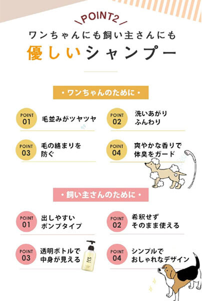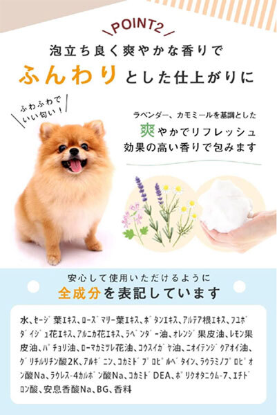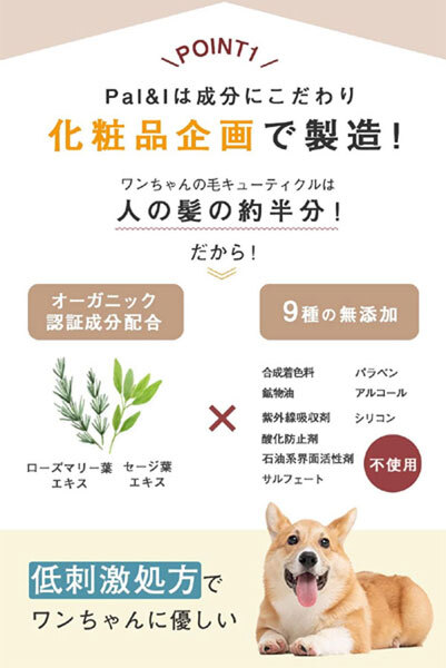 内 容 | ■PAL&I 犬用シャンプー ■内容量:300ml ■日本製 天然由来成分で肌にやさしい、 ワンちゃんも飼い主さんもいたわるオーガニックシャンプーです。 ワンちゃんの毛のキューティクルは人間の髪の約半分。 成分にしっかりこだわって開発しました。 |