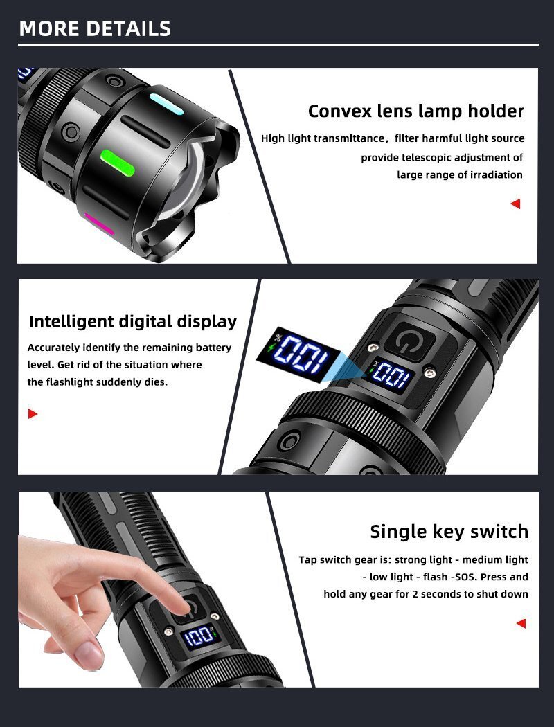 ■5000mahの大容量、20W白色レーザー懐中電灯、5速切り替え、日常生活防水防雨、アウトドア、緊急時、夜釣り、冒険など様々なシーンでの使用に適しています。 ★パワーディスプレイ、いつでも残量を知ることができます。 ★一体型デザイン、完全密閉構造、強力な防水性。 ★伸縮ズーム機能、遠近照明を自由に切り替え可能。 ★緊急充電器として使えるパワーバンク機能付き。 ★USBインターフェース、さまざまなデバイス電源と互換性があり、ラップトップ、車、モバイル電源などと互換性があります。 ★5000mahのバッテリー容量、長時間使用。 ★強光-中光-弱光-ストロボ-SOSの5段階光切替。 【状態】:新品未使用 【色】: ブラック 【電球】: 20W 白色光レーザー 【サイズ】: 33*50*171mm 【重量】: 306g 【バッテリー】: 1*26650 【容量】: 5000mah 【充電方式】:Type-C充電 【ギア設定】: 強光-中光-弱光-ストロボ-SOS 【ズームモード】:望遠ズーム 【材質】:アルミニウム合金 【ディスプレイ】: パワーディスプレイ 【付属品】: 梱包箱 * 1 + 裸ランプ * 1 + 26650 (5000 mah) リチウム電池 * 1 + type-c データケーブル * 1 + 英語マニュアル * 1 |