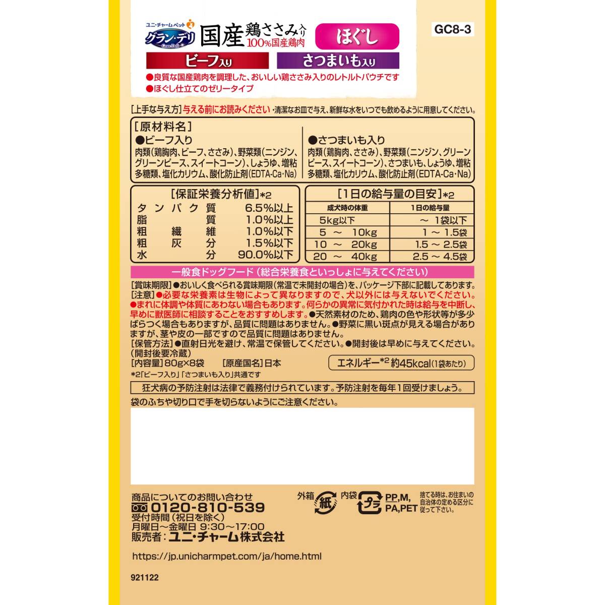 | 商品名 | グラン・デリ グランデリ ドッグフード ウェット 国産鶏ささみ パウチ ほぐし 成犬用 8個パック ビーフ入り・さつまいも入り 80g |