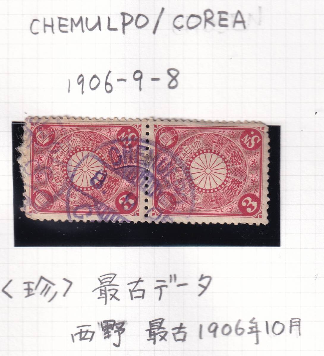 (西野では、1906年10月、元山とChemulpo(済物浦)の使用が最古とされています。)