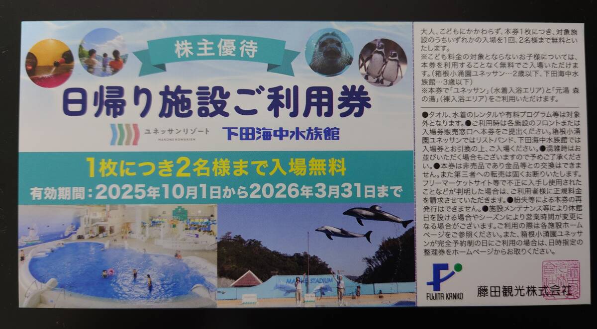 【送料無料】 藤田観光 株主優待 日帰り施設利用券 2枚(4人分) ユネッサン 下田海中水族館
