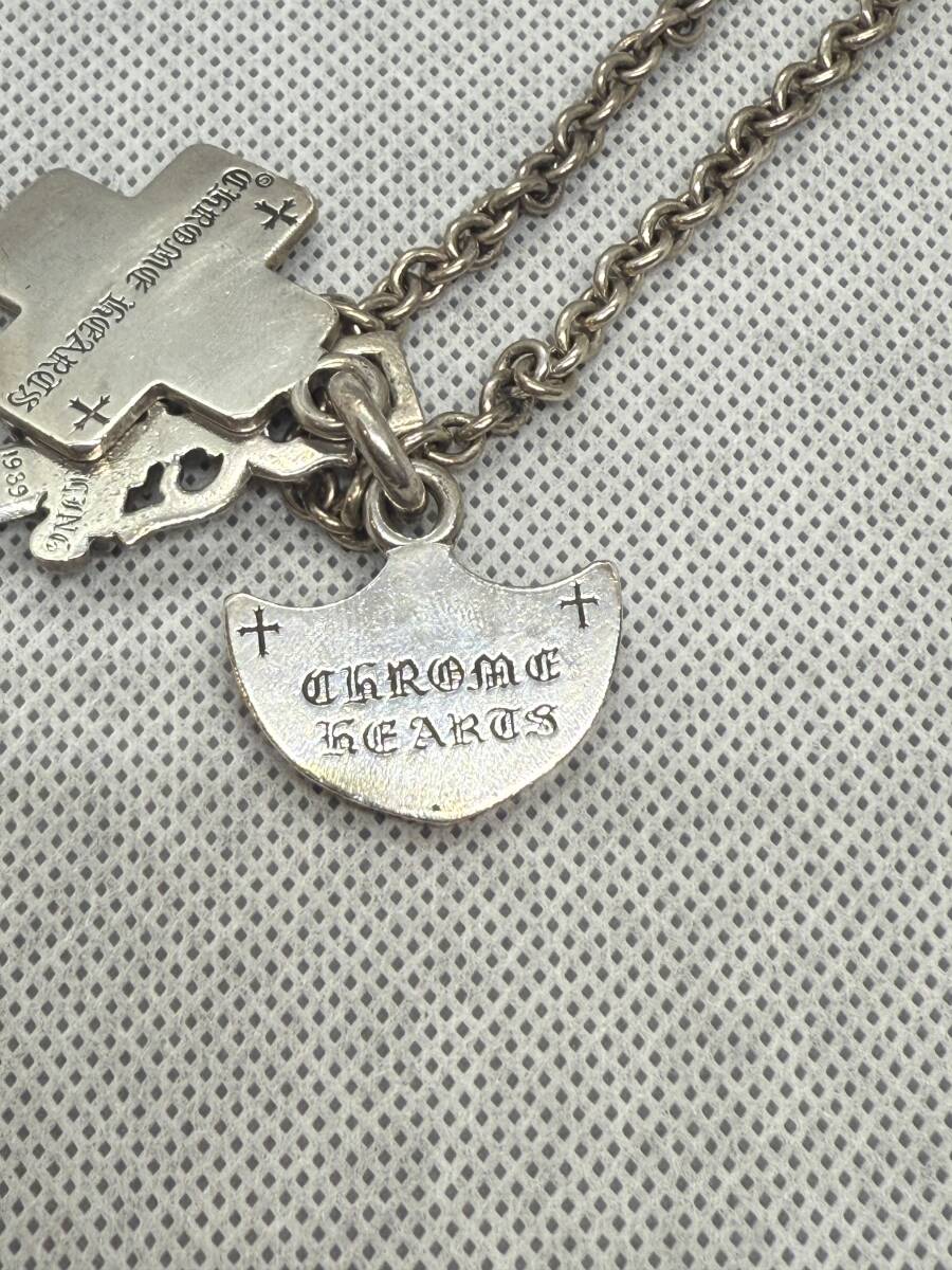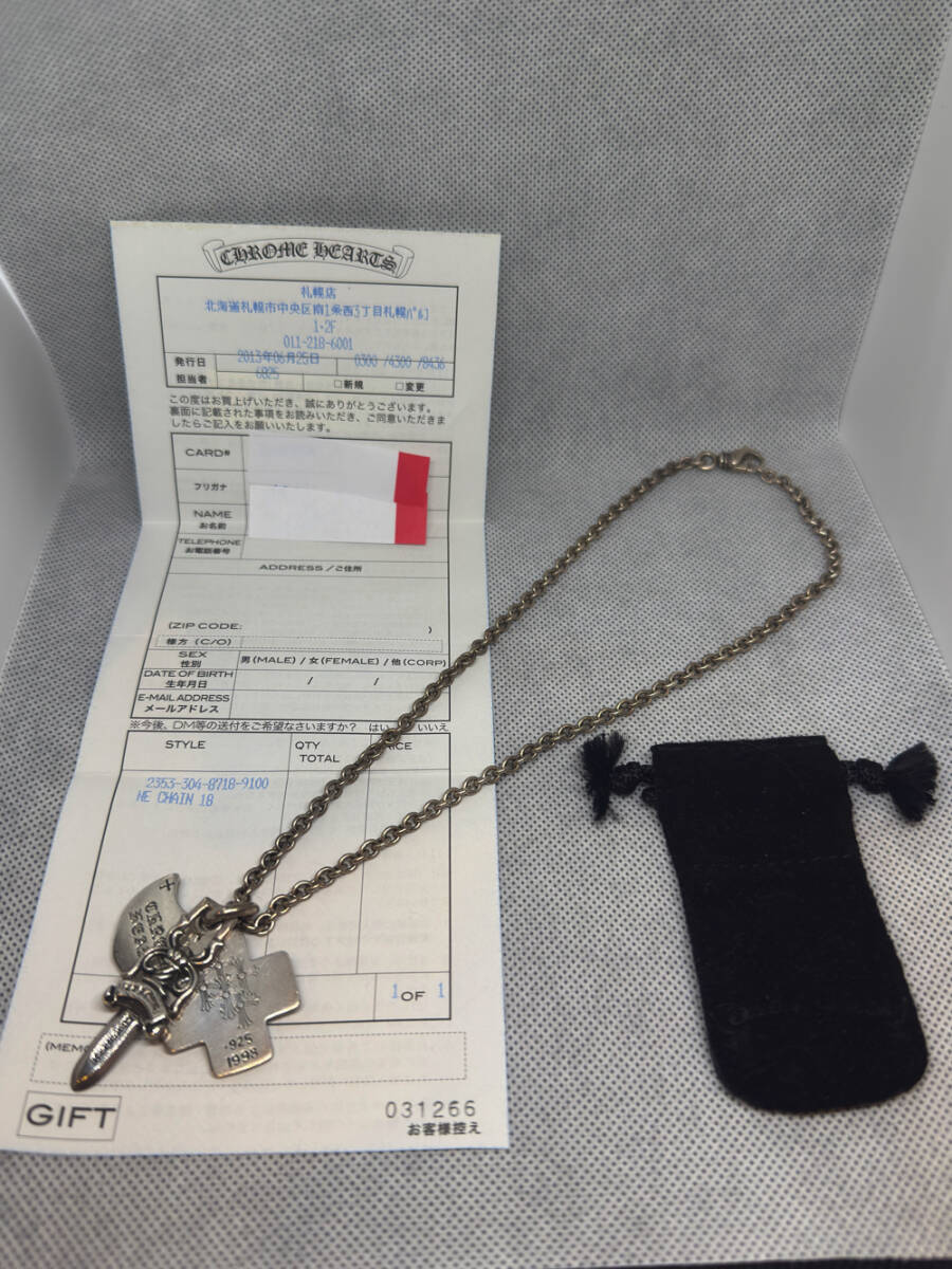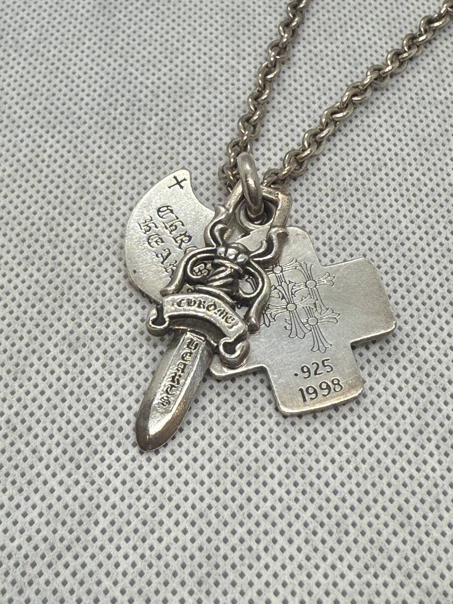 ■サイズ ・スリートリンケッツ クロス:縦34mm×横27mm×厚さ2mm ダガー:縦42mm×横15mm×厚さ3mm アンカー:縦25mm×横27mm×厚さ2mm 重さ:26g ・NEチェーン:18インチ(約45cm) ■付属品 本体、インボイス原本(NEチェーン)、布袋1個 ■購入店舗 クロムハーツ札幌店 ■価格 スリートリンケッツ:約26万円(ブラックシンフォニー調べ) https://www.black-symphony.com/SHOP/3trinkets-pendant.html NEチェーン:約16万円(ブラックシンフォニー調べ) https://www.black-symphony.com/SHOP/ne-chain-18inch.html クロムハーツのスリートリンケッツ&NEチェーンのセットです。 スリートリンケッツはダガー、アンカー、クロスのモチーフが重なって動くたびに胸元の表情を変えてくれます。 クロムハーツのオーナー兼デザイナーのリチャード・スターク自らがデザインし愛用していたもので多くの有名人も着用しています。 NEチェーンはペーパーチェーンと並んで人気のネックレスチェーンで、重厚さをウリにしたペーパーチェーンネックレスと比べて、スッキリとした印象を与えてくれるのが最大の特徴となります。 シンプルなデザインですが、ハードなデザインのネックレストップにも負けずに存在感をしっかりと主張してくれます。 NEチェーンは札幌に行った際に直営店で購入しました。 インボイス原本付きです。塗りつぶしなしでお譲りします。 スリートリンケッツはインボイスが見当たらないのですが、実店舗でしか購入しないため自身購入の正規品になります。 メルカリの鑑定対応しておりますので、ご不安な場合は鑑定機能などをご利用ください。 最近のクロムハーツはそもそも品薄で在庫がない状態のものが多く、こちらもなかなか手に入らず数年待ちなどの可能性もあり貴重だと思います。 状態は一般的な中古品で、しばらく着けていませんでしたが、昔は普通に着用していたので良い感じに味が出ていると思います。 なお、この商品は他モールへの出品もしております。 購入が確認できた時点で出品は取り下げるようにしていますが、常に確認するのは難しくタイミング的に取り下げが間に合わずに同時購入となってしまう可能性もあります。 あまりないケースだとは思いますが、その場合は先に購入された方を優先させていただきますので、あらかじめご了承ください。 他にも出品していますので よかったらチェックしてみてください☆ その他の出品物 また、入札の前には必ず自己紹介をご覧ください。 ※入札=自己紹介には同意いただけたものとします。 よろしくお願いします。 |