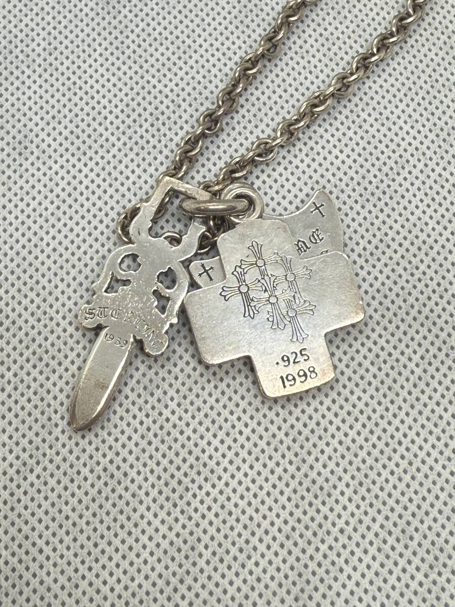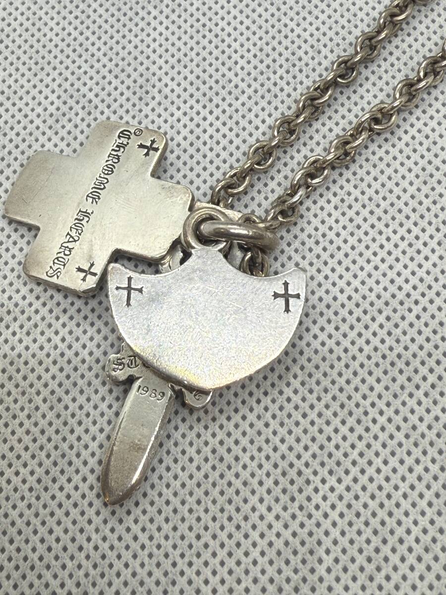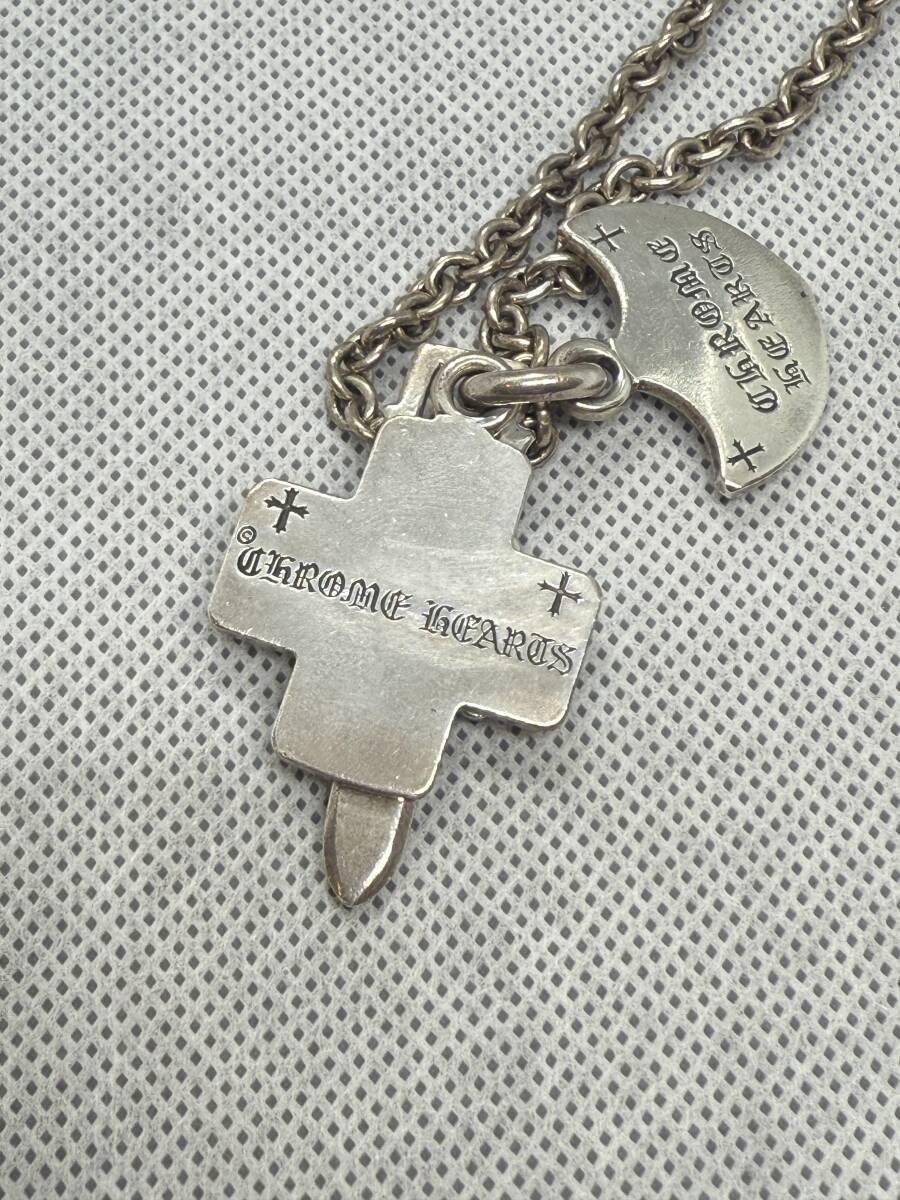 ■サイズ ・スリートリンケッツ クロス:縦34mm×横27mm×厚さ2mm ダガー:縦42mm×横15mm×厚さ3mm アンカー:縦25mm×横27mm×厚さ2mm 重さ:26g ・NEチェーン:18インチ(約45cm) ■付属品 本体、インボイス原本(NEチェーン)、布袋1個 ■購入店舗 クロムハーツ札幌店 ■価格 スリートリンケッツ:約26万円(ブラックシンフォニー調べ) https://www.black-symphony.com/SHOP/3trinkets-pendant.html NEチェーン:約16万円(ブラックシンフォニー調べ) https://www.black-symphony.com/SHOP/ne-chain-18inch.html クロムハーツのスリートリンケッツ&NEチェーンのセットです。 スリートリンケッツはダガー、アンカー、クロスのモチーフが重なって動くたびに胸元の表情を変えてくれます。 クロムハーツのオーナー兼デザイナーのリチャード・スターク自らがデザインし愛用していたもので多くの有名人も着用しています。 NEチェーンはペーパーチェーンと並んで人気のネックレスチェーンで、重厚さをウリにしたペーパーチェーンネックレスと比べて、スッキリとした印象を与えてくれるのが最大の特徴となります。 シンプルなデザインですが、ハードなデザインのネックレストップにも負けずに存在感をしっかりと主張してくれます。 NEチェーンは札幌に行った際に直営店で購入しました。 インボイス原本付きです。塗りつぶしなしでお譲りします。 スリートリンケッツはインボイスが見当たらないのですが、実店舗でしか購入しないため自身購入の正規品になります。 メルカリの鑑定対応しておりますので、ご不安な場合は鑑定機能などをご利用ください。 最近のクロムハーツはそもそも品薄で在庫がない状態のものが多く、こちらもなかなか手に入らず数年待ちなどの可能性もあり貴重だと思います。 状態は一般的な中古品で、しばらく着けていませんでしたが、昔は普通に着用していたので良い感じに味が出ていると思います。 なお、この商品は他モールへの出品もしております。 購入が確認できた時点で出品は取り下げるようにしていますが、常に確認するのは難しくタイミング的に取り下げが間に合わずに同時購入となってしまう可能性もあります。 あまりないケースだとは思いますが、その場合は先に購入された方を優先させていただきますので、あらかじめご了承ください。 他にも出品していますので よかったらチェックしてみてください☆ その他の出品物 また、入札の前には必ず自己紹介をご覧ください。 ※入札=自己紹介には同意いただけたものとします。 よろしくお願いします。 |