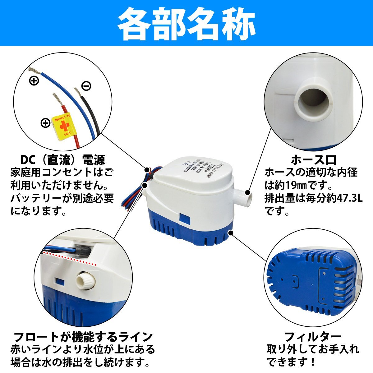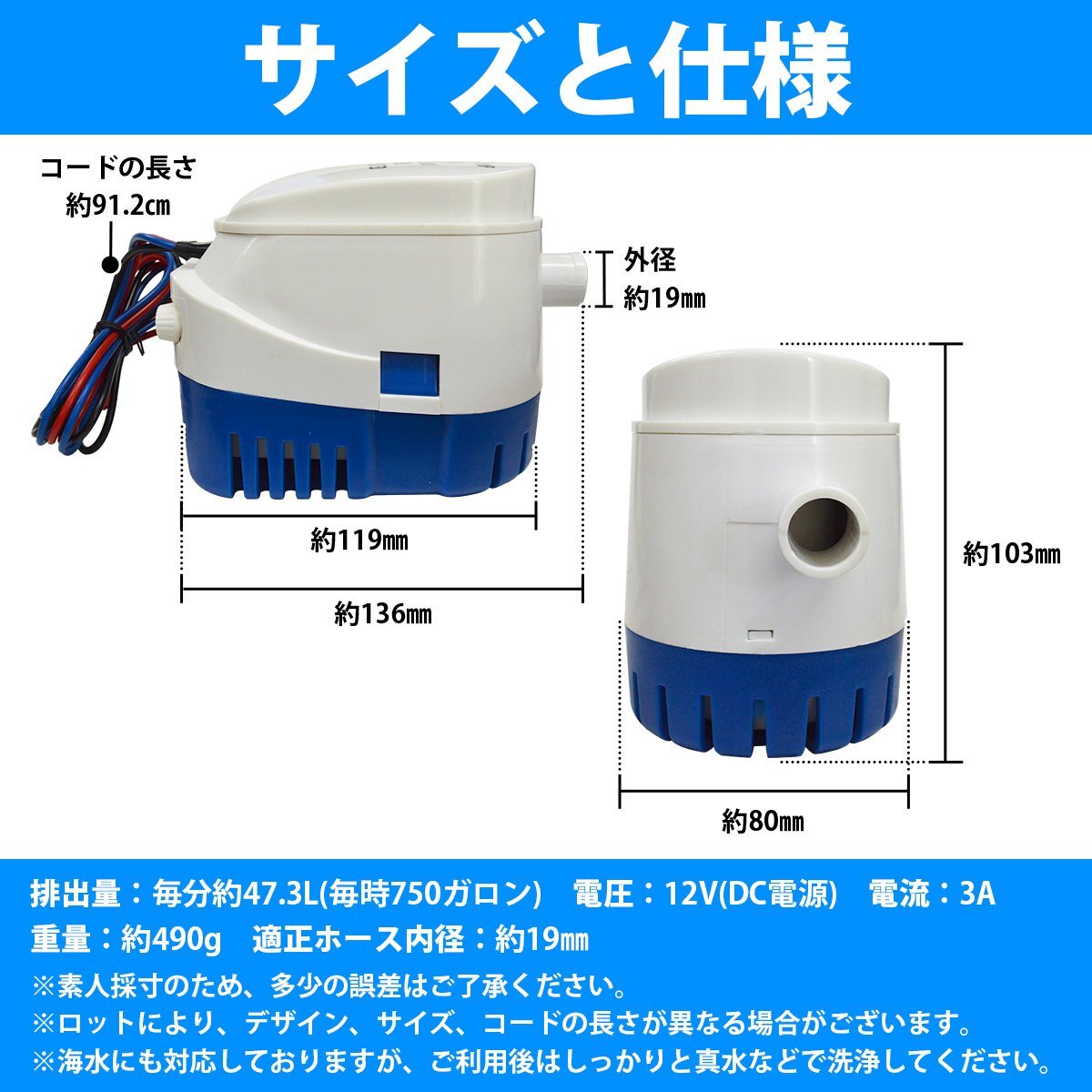 12V ビルジポンプ 750GPH フロート スイッチ 一体型 毎分47L 水中 ポンプ 船 ボート ヨット 船舶 漁船 汲み上げ 自動排水
