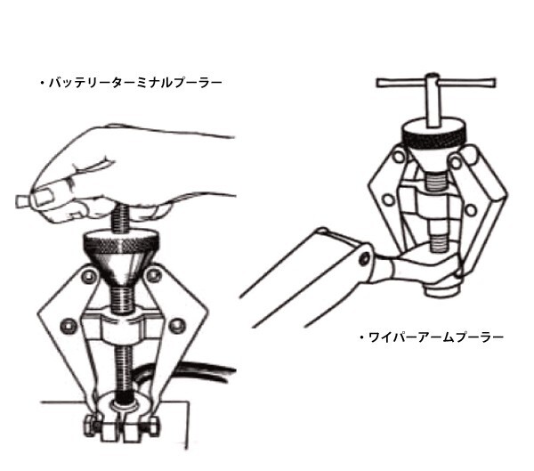 | 商品詳細 | この工具で二つの使い方ができます。 1.バッテリーターミナルプーラーとして ・固くなったバッテリー端子を簡単に取り外します。 ・使用方法:ケーブルクランプの下にジョーを押し付けるためにローレットコーンを締めます。センタースクリューを回してクランプを端子から持ち上げます。 2.ワイパーアームプーラーとして ・テーパスプラインにフィットするボルト止めのワイパーアームを取り外します。 プーラースクリューパッドは、容易に引き出すためにスプラインポストの上部にフィットするように設計されています。 ■商品仕様 ・全長:110mm ・重量:260g |