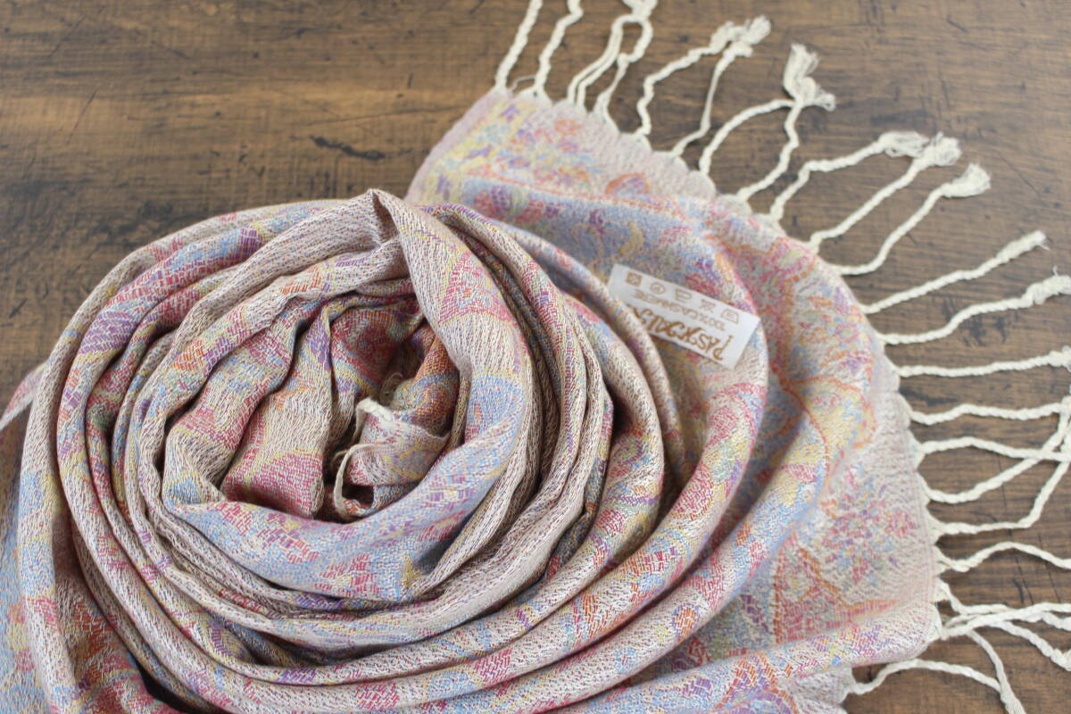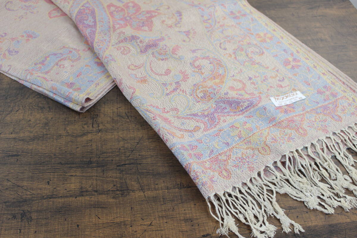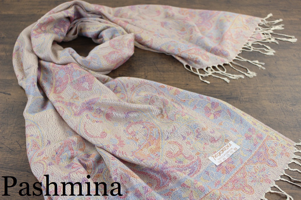 新品【パシュミナ Pashmina】華ペイズリー柄 ベージュ系マルチカラー 大判 ストール カシミア100% Cashmere