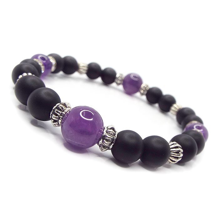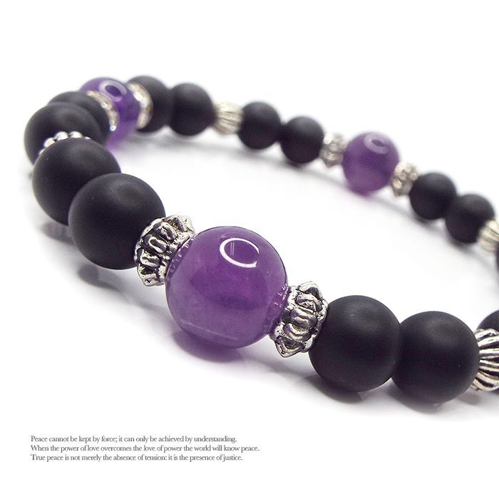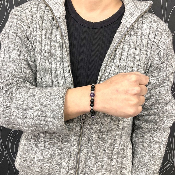 【STONE KITCHEN 天然石 パワーストーン】 鮮やかなアメジストに相性の良いマットオニキスをあしらい 石が際立つブレスレットに仕上がりました☆ 幸を運んでくれ、邪気を払ってくれるお守りブレス♪ アメジストとマットオニキスはとても相性の良い組み合わせで お互いにお互いのパワーを高めあうと言われています☆ アメジストは調和と安定のパワーを持ち ネガティブなパワーを寄せ付けないという 強い邪気祓いのパワーを持つと言われています☆ 恋愛から心の安定、ビジネスでの成功など とても幅広いサポートをしてくれるブレスレットです!!! 内周:約18cm サイズ:アメジスト 約10mm・約8mm マットオニキス 約8mm 1点 注意事項 ※金属部分は汗や汚れ等で変色する場合がございます。気になる場合は 金属磨きや布等で軽くふき取る事をおすすめします。 ※石の種類によっては、艶を引き出すことを目的として、ワックスや着色加工がされているものもあります。 ※表示のサイズは必ずしも最大値・最小値のサイズのものが入っているわけではございません。 ※天然石のため同じものでも色味・模様などが異なります。 ※照明の具合で実際とは色合いが異なる場合がございます。 また、天然素材特有のクラック・内包物を有する場合がございます。予めご了承下さい。 | |||